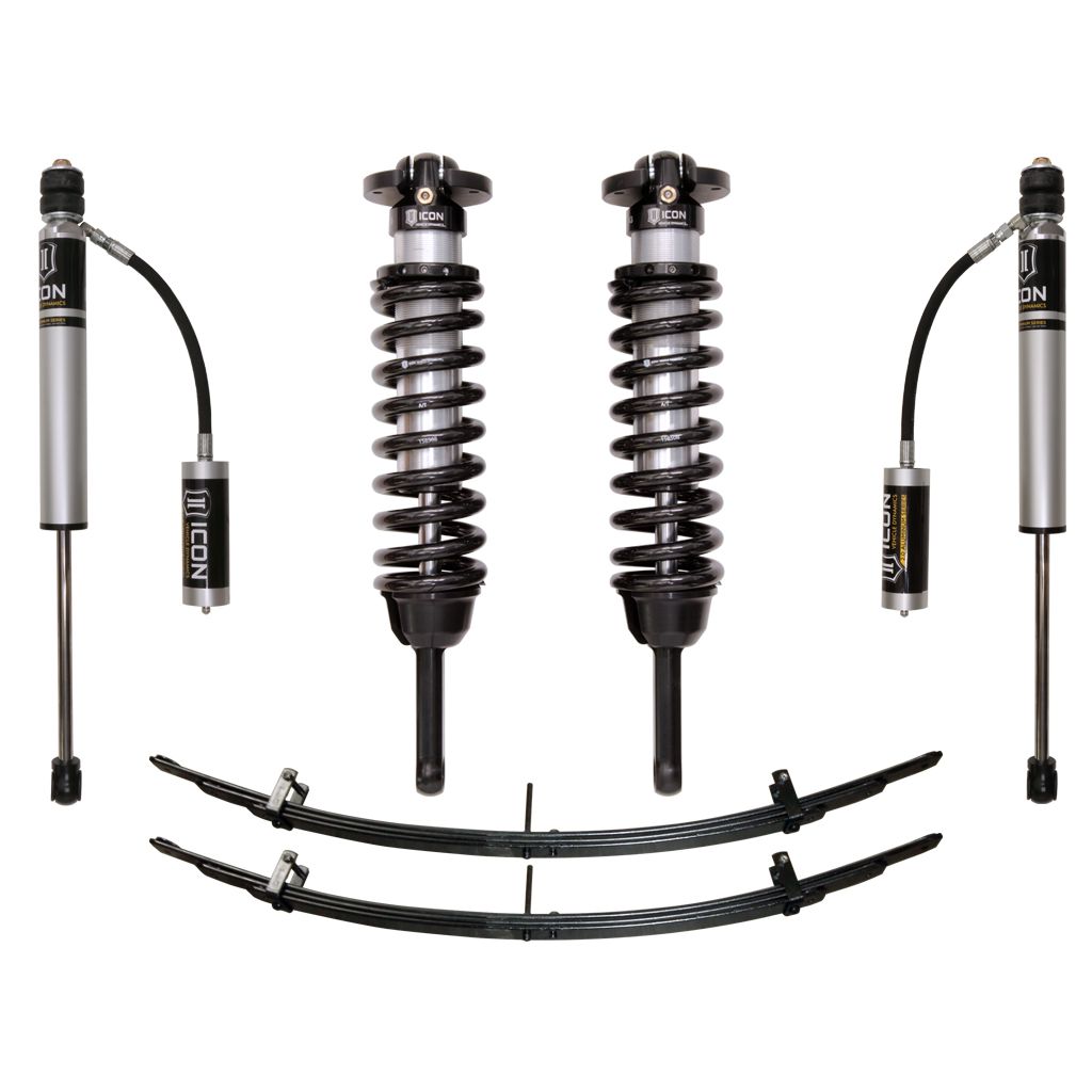 ICON Vehicle Dynamics Toyota Tacoma suspension systems are designed with maximum performance and the serious driver in mind. ICON engineers’ primary focus is to increase wheel travel and damping ability, which translates into outstanding vehicle control and ride quality both on and off-road. The Stage 2 system includes vehicle-specific tuned 2.5” coilover shocks featuring an internal reservoir for exceptional cooling properties and ICON-engineered coil springs for superior vehicle “feel” through the range of travel. These coilovers are also height adjustable from 0-3.5” of lift on 2005-2015 or 0-2.75” on 2016-2023 models allowing the use of larger, more aggressive wheel and tire combinations. Remote reservoir ICON 2.0 Aluminum Series rear shocks utilize a vehicle-specific valving that balances the performance of the truck from front to rear. The included rear Add-A-Leaf Kit Installs in place of the factory overload leaves and effectively lowers the rear spring rate by approximately 10% for a more compliant ride while also providing 1.5" of rear lift over stock. The ICON Vehicle Dynamics 2005-2023 Toyota Tacoma Stage 2 suspension system is an excellent choice for those drivers looking to enhance the capabilities of their pickup on the road as well as in the dirt.
