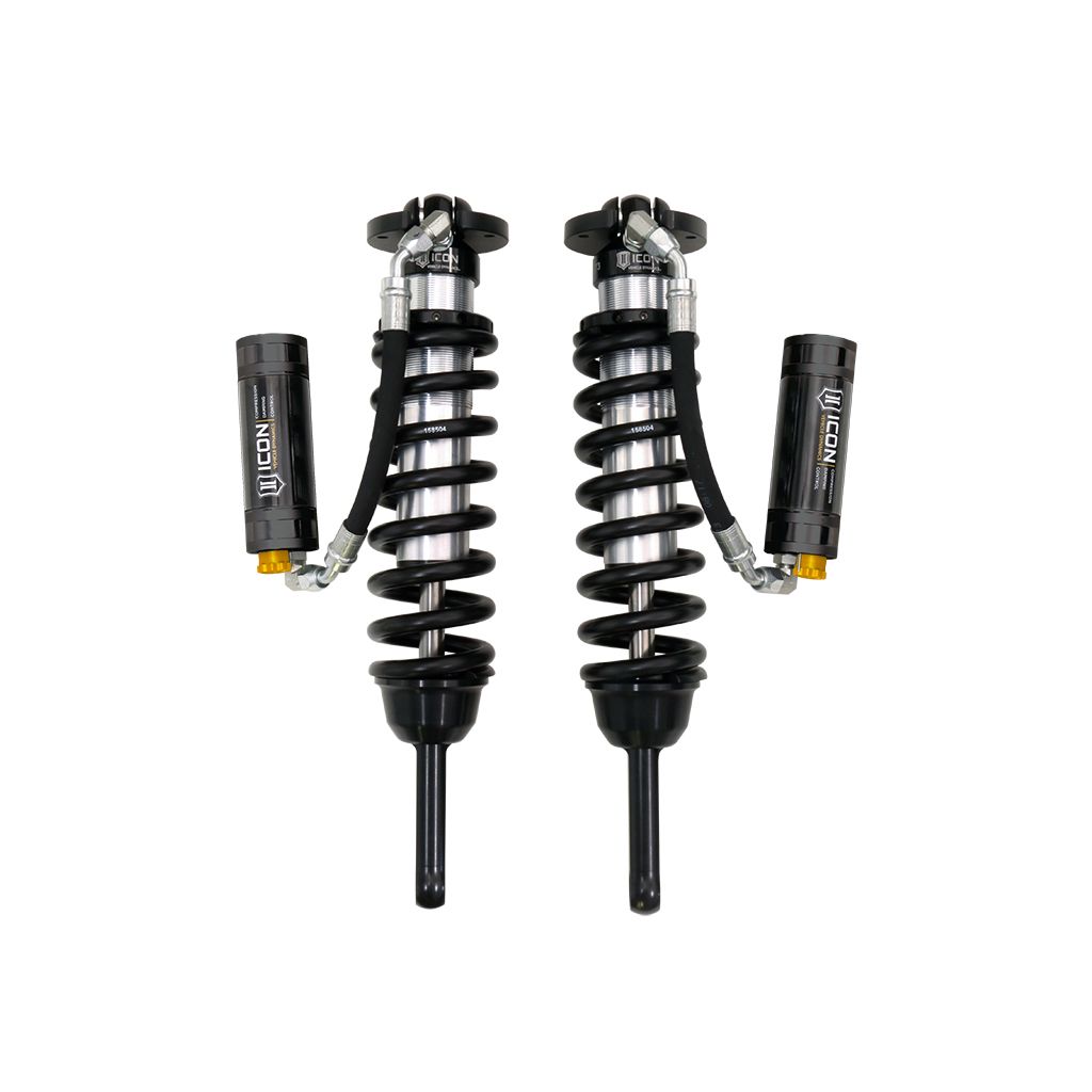 ICON Vehicle Dynamics V.S. 2.5 Series remote reservoir front coilover shocks are an incredible upgrade for the front end of the 2005-2023 Toyota Tacoma. These adjustable coilovers allow up to 0-3.5” of lift height adjustability on 2005-2015 models or 0-2.75” of lift height adjustability on 2016-2023 models, allowing the use of larger, more aggressive wheel and tire combinations. ICON’s Vehicle-specific shock length and valving along with the larger 2.5” shock body and increased piston area over stock components yield the maximum travel possible along with superior ride quality and suspension performance both on- and off-road. Remote reservoirs greatly increase shock oil volume and heat dissipation surface area to resist overheating and cavitation under hard use, which can lead to damper fade. Their extended travel length allows for more wheel travel but also requires the installation of aftermarket front upper control arms. ICON's exclusive Compression Damping Control Valves are included for precisely dialing in your suspension performance. CDCV controls fluid flow under compression, allowing you to achieve the perfect tune whether driving on the street, slow-crawling through the rocks or mobbing across the desert at full throttle. To better support the weight of additional accessories such as aftermarket front bumpers and winches, these coilovers include ICON engineered coil springs with an increased, 700 lbs/in spring rate, allowing for taller ride heights with increased front end weight. When paired with ICON 2.0 or 2.5 Aluminum Series rear shock absorbers vehicle control will be balanced front to rear, resulting in the best overall driving experience for your Toyota Tacoma.