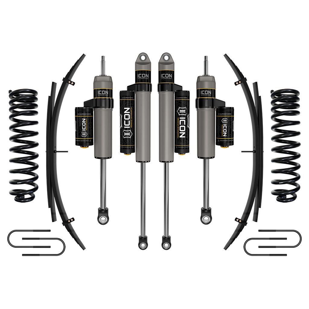 The ICON 2.5” suspension system is a great way to lift your 4WD 2008-2010 Ford F-250/F-350 Super Duty while improving ride quality and performance. This upgraded Stage 3 system is great for towing, rough construction site terrains, and country dirt roads all while keeping a smooth highway feel. ICON's Stage 3 System is comprised of dual rate coil springs, 2.5 Aluminum Series piggyback reservoir front and rear shocks, alignment cams for adding caster, and rear leaf spring expansion packs with blocks and U-bolts for a more compliant ride and reduced axle wrap. ICON 2.5" piggyback reservoir shocks ensure optimum performance by increasing the duration of consistent damping regardless of situation, keeping the shocks at a cooler operating temperature during heavy use. With the endless hours ICON has spent testing and tuning our suspension components and shocks as a complete package, you can rest assured you have the best suspension solution on the market.