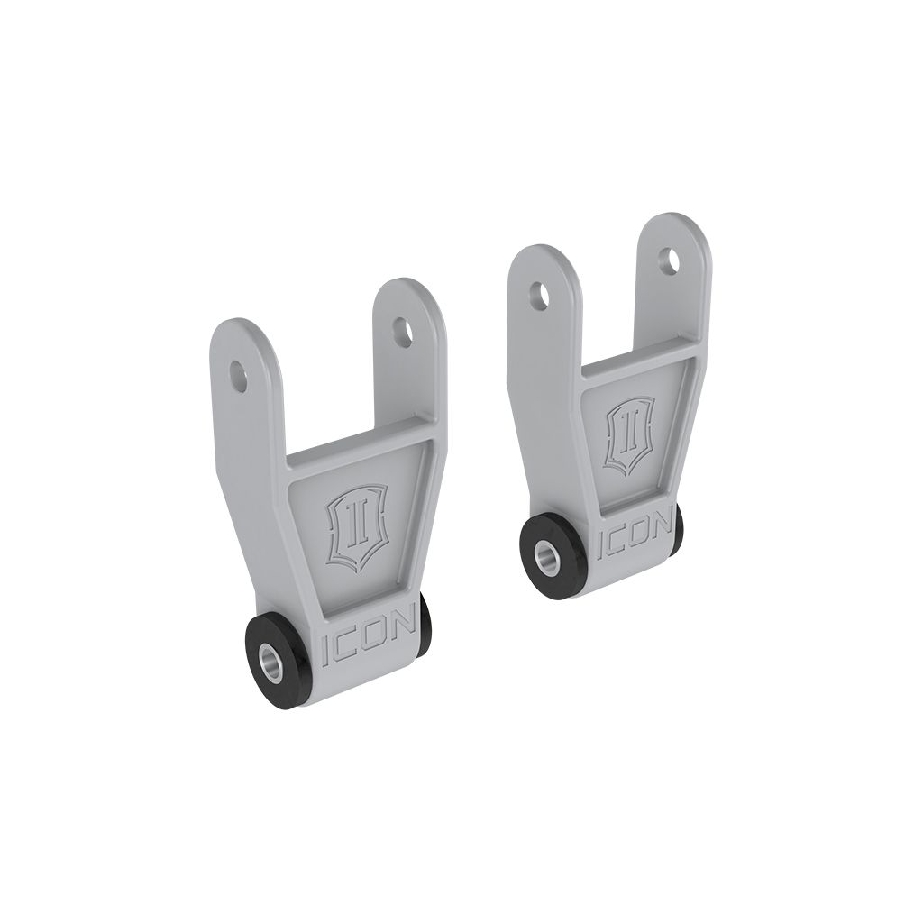 Fine tune the rear ride height on your 2010-2025 Ford F-150 with ICON Vehicle Dynamics’ Billet Aluminum Lowering Shackle Kit. CNC machined from 6061 aviation grade aluminum; these billet shackles offer increased strength compared to the thin steel of the stock units to better withstand the stresses of aggressive off-road use. Their increased length also lowers the rear ride height of the truck by 1”, requiring less front lift to achieve a level stance or to assist in rear ride height tuning with aftermarket leaf springs. Their gusseted design ensures proper bushing clearance to allow fitment for stock leaf springs, ICON F-150 Multi-Rate Leaf Springs, and most other aftermarket spring packs for a wide range of suspension setup options. Pre-installed, replaceable, press in OE Ford bonded bushings make for an easy install, require no periodic greasing, and offer noise free operation while still cycling full suspension travel. The shackles look as great as they perform with a satin gray anodized finish.