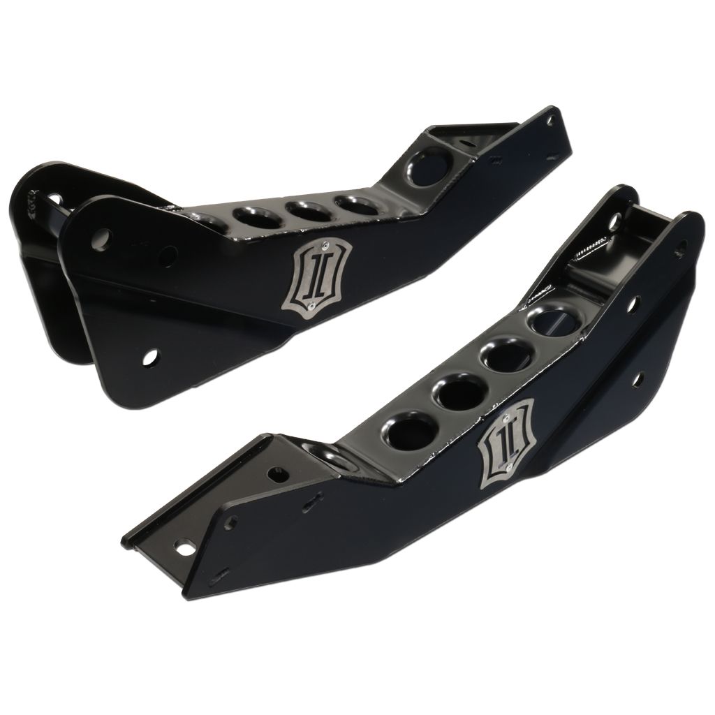 The ICON Radius Arm Drop Kit for the 2011-2016 Ford F-250/F-350 Super Duty 4WD allows the use of the stock or aftermarket radius arms with ICON 4.5”-7” lift suspension systems. This kit consists of fabricated radius arm drop brackets, CNC laser cut and brake-formed from steel plate and engineered to withstand the stresses of aggressive off-road driving. The drop brackets look as great as they perform with a durable semi-gloss black powder coat finish. Wheel with confidence knowing that the brackets are covered by ICON's Limited Lifetime Warranty.