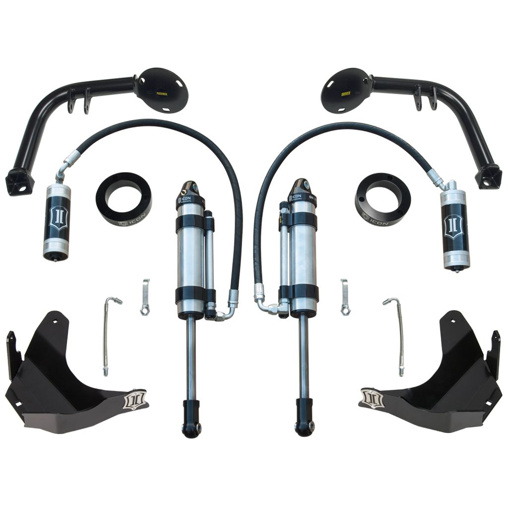 The S2 Secondary Shock System utilizes the factory lower control arms and maintains OE track width while a combination of a billet aluminum shock tower adapters, fabricated shock hoops, and steel skid plates (with incorporated shock mounts) make for a straightforward install with the exceptional build quality you would expect from an ICON Vehicle Dynamics product. The system was designed to eliminate the need for any major alteration of the vehicle’s frame or any other factory suspension components, and the components are 100% removable in case the system is to be installed on another vehicle. The modular design of the S2 kit also allows for standalone installation of the skid plates, which provides the added benefit of protecting the factory lower control arms from potential trail damage that can be experienced while off-road.