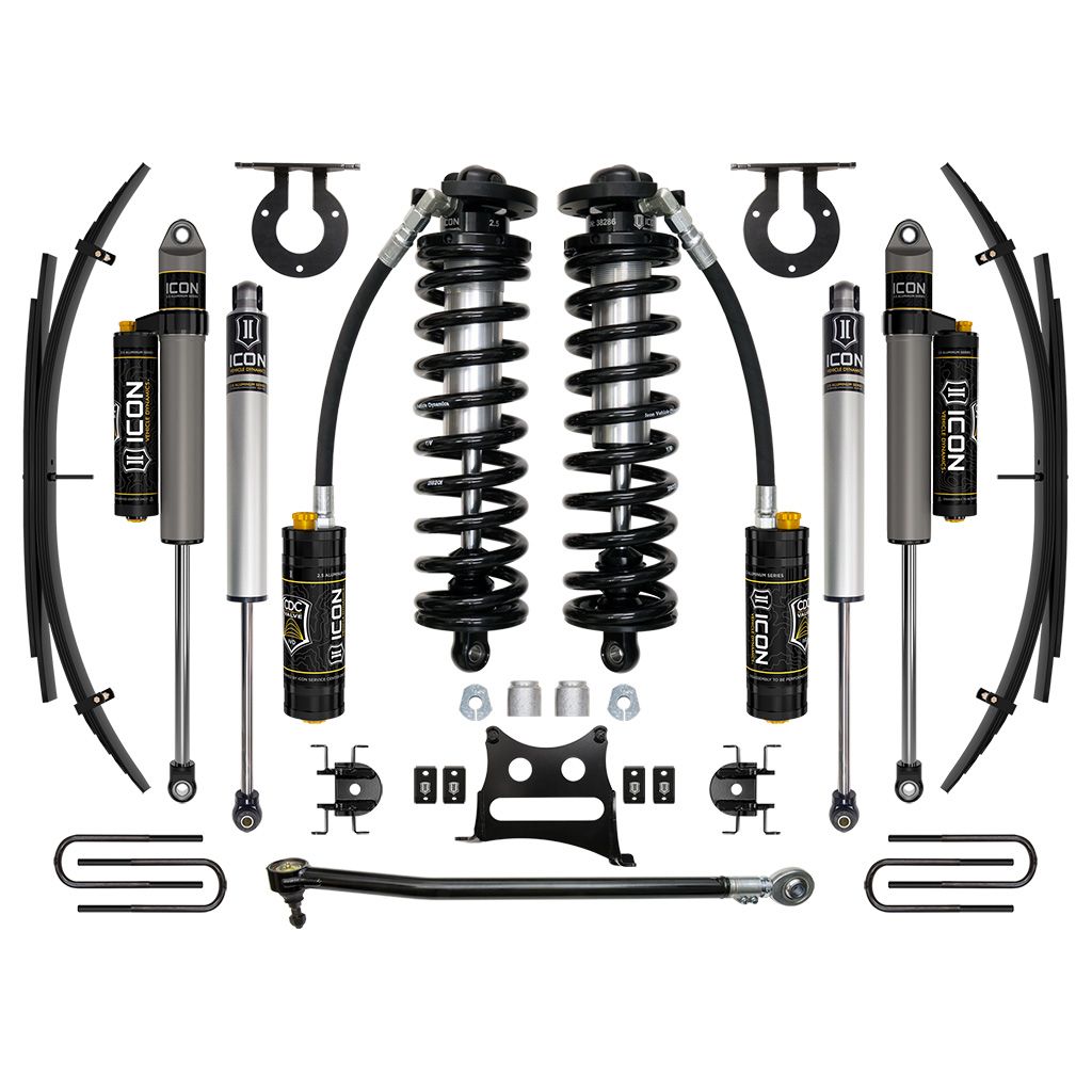 The ICON 2.5-3” coilover conversion suspension system is a great way to lift your 4WD 2017-2022 Ford F-250/F-350 Super Duty while improving ride quality and performance. This upgraded Stage 4 system is great for towing, rough construction site terrains, and country dirt roads all while keeping a smooth highway feel. Also included in this stage is ICON's CDC Valve front and rear shocks, for those desiring an easy way to tune the ride externally with 10 settings, from soft to hard. ICON's Stage 4 System is comprised of 2.5 Series CDCV remote reservoir coilovers that are adjustable from 2.5-3” or 3.25-3.75 of front lift over stock (depending on year model and option package), adjustable front track bar with massive FK rod end, dual steering stabilizer kit with ICON 2.0 Aluminum Series stabilizers, alignment cams for adding caster, rear leaf spring expansion packs with blocks and U-bolts for a more compliant ride and reduced axle wrap, and ICON 2.5 Aluminum Series CDCV piggyback reservoir rear shocks. ICON 2.5 Series remote and piggyback reservoirs ensure optimum performance by increasing the duration of consistent damping regardless of situation, keeping the shocks at a cooler operating temperature during heavy use. With the endless hours ICON has spent testing and tuning our suspension components and shocks as a complete package, you can rest assured you have the best suspension solution on the market.