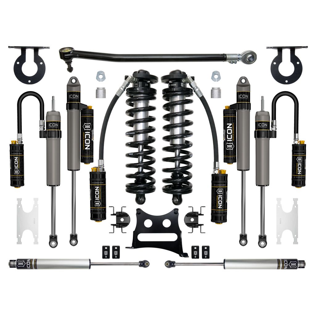ICON's 2.5 VS Series Remote Reservoir Bolt-In Coilover Conversion Kit will add a new level of performance and adjustability to 2017-2022 F-250 and F-350 trucks. The advantage of utilizing a coilover conversion kit is that they have been designed to increase the overall damping ability of the vehicle while at the same time allowing for user-defined ride height adjustment. The 2.5" Remote Reservoir Coilover featured in these kits is based off of ICON’s 2.5 Series shock line – meaning that features like Eibach coil springs, FK Rod End bearings, and vehicle-specific valving come standard. Quality machined components and a fully serviceable design make for a product that will stand the test of time, yet retain the ability to be rebuilt or re-valved as necessary.