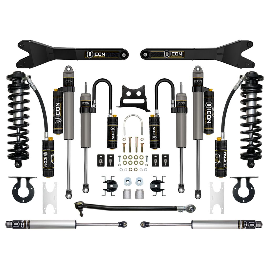This Stage 6 system sees the inclusion of the ICON Vehicle Dynamics Ford Super Duty Radius Arm System that feature a sealed pivot bushing that minimizes road feedback and ensures a long life and quiet operation. Additionally, their fabricated, fully boxed design ensures strength and utilizes a profile optimized for tire clearance at full steering lock, making a 37” tall tire clear without coming in contact with the radius arm.