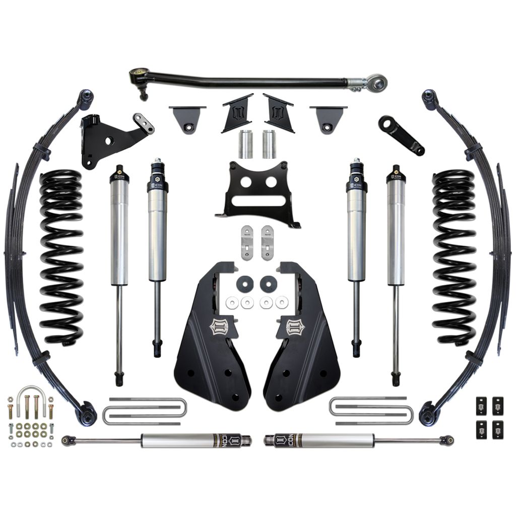 This ICON Vehicle Dynamics 7” suspension system is a great way to lift your 4WD 2017-2022 Ford F-250/F-350 Super Duty while drastically improving ride quality and performance. This suspension system is perfect for on-road and off-road use including towing, job site duty, and general off-road adventure. ICON's 7" Stage 2 System is comprised of dual rate coil springs, progressive leaf springs, radius arm drop brackets, adjustable track bar, dual opposing steering stabilizer kit, ICON 2.5 Aluminum Series internal reservoir front and rear shocks, plus all of the necessary hardware for installation. With the endless hours ICON has spent testing and tuning our suspension components and shocks as a complete package, you can rest assured you have the best suspension solution on the market.
