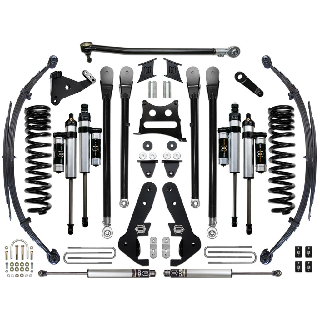 The Stage 4 system sees the inclusion of the ICON Vehicle Dynamics Ford Super Duty 4-Link kit, which further improves performance by eliminating suspension bind commonly experienced with factory radius arms during articulation. This “freeing up” of the front end and the ability of the 4-Link Kit to maintain positive caster through the range of travel equates to an unparalleled ride quality in all conditions. With the endless hours ICON has spent testing and tuning our suspension components and shocks as a complete package, you can rest assured knowing that you have the best suspension solution on the market.
