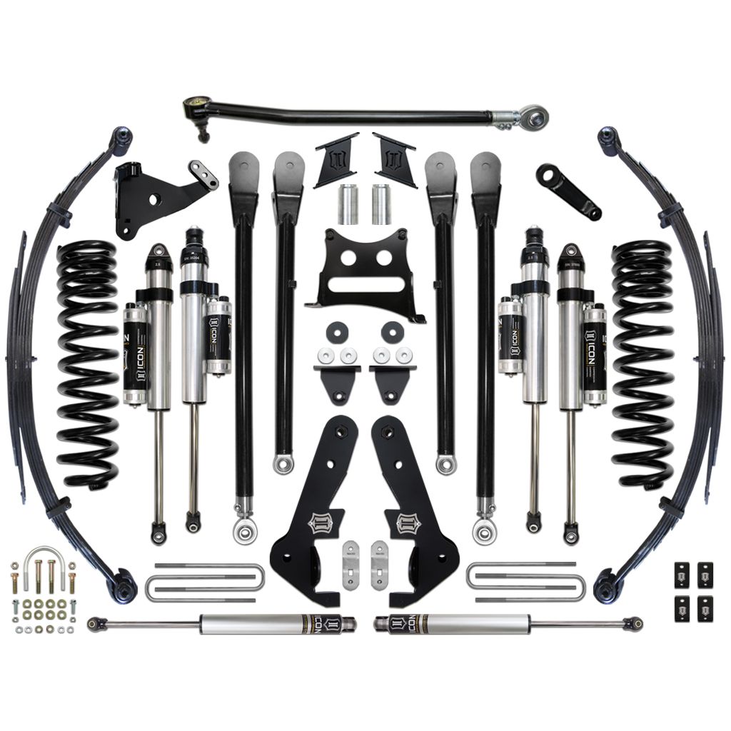 The Stage 5 system sees the inclusion of the ICON Vehicle Dynamics Ford Super Duty 4-Link kit, which further improves performance by eliminating suspension bind commonly experienced with factory radius arms during articulation. This “freeing up” of the front end and the ability of the 4-Link Kit to maintain positive caster through the range of travel equates to an unparalleled ride quality in all conditions. With the endless hours ICON has spent testing and tuning our suspension components and shocks as a complete package, you can rest assured knowing that you have the best suspension solution on the market.