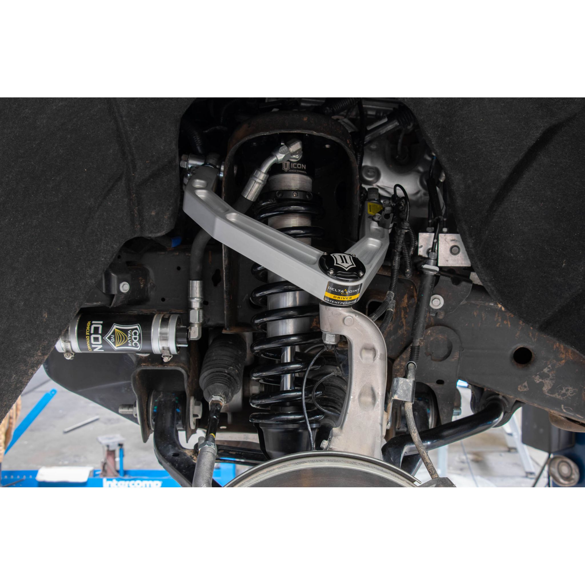 These upper control arms feature ICON's patented Delta Joint. The Delta Joint is a heavy-duty high angle ball joint that combines the durability of a ball joint with the performance characteristics of a traditional uniball. While the industry standard uniball does a great job of allowing the control arms of a vehicle to articulate with little bind, they do have an inherent weakness that leaves more to be desired when used in a daily driven application – exposure to the elements. The Delta Joint features a zinc plated housing providing the first layer of corrosion resistance, while a tough grease seal keeps potentially harmful elements out of the inner workings of the joint. Metal on metal construction and a greaseable design increase the longevity of the Delta Joint while at the same time allowing for noise-free operation. What makes the Delta Joint unique is that it brings the best of both worlds to ICON upper control arms with features that make it more robust than a uniball, and at the same time capable of greater angularity than a typical ball joint.