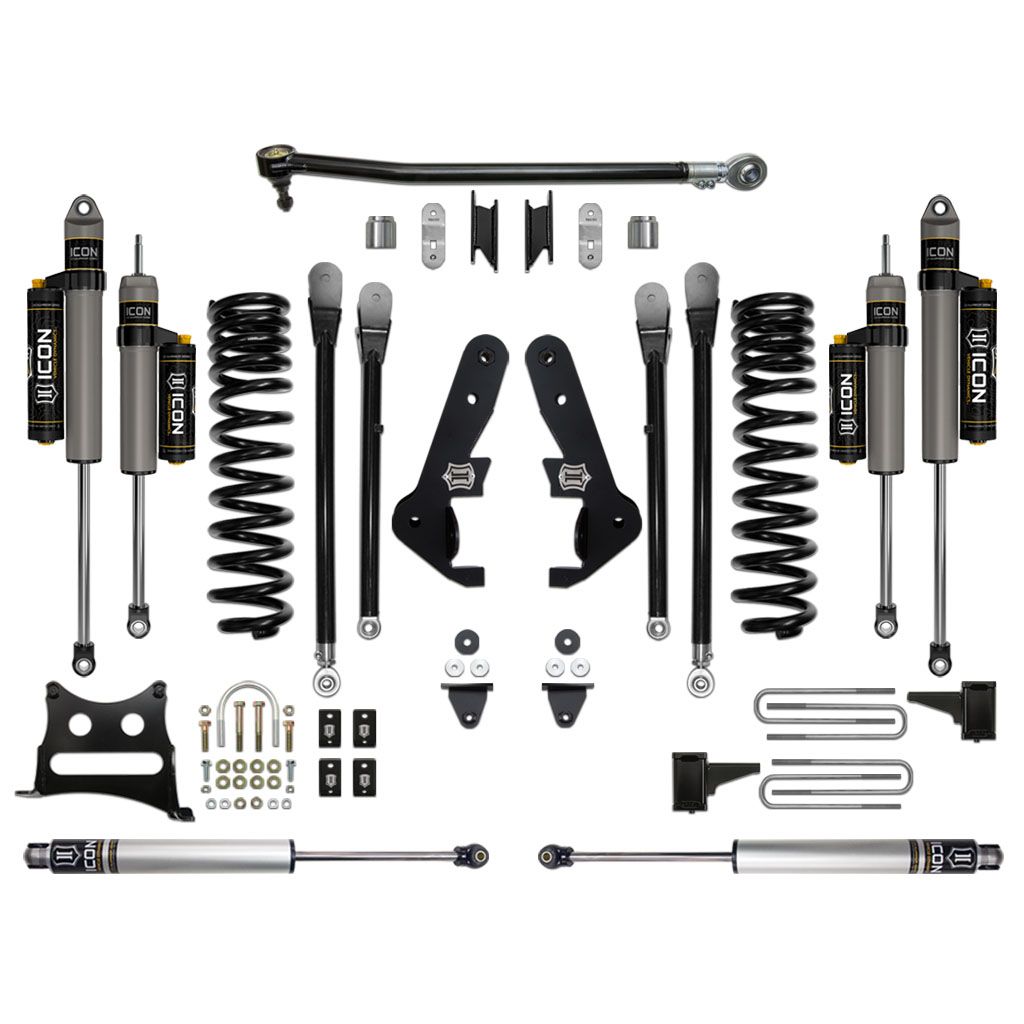 The Stage 5 system sees the inclusion of the ICON Vehicle Dynamics Ford Super Duty 4-Link kit, which further improves performance by eliminating suspension bind commonly experienced with factory radius arms during articulation. This “freeing up” of the front end and the ability of the 4-Link Kit to maintain positive caster through the range of travel equates to an unparalleled ride quality in all conditions. With the endless hours ICON has spent testing and tuning our suspension components and shocks as a complete package, you can rest assured knowing that you have the best suspension solution on the market.