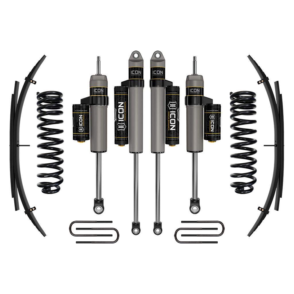 The ICON 2.5” suspension system is a great way to lift your 4WD 2020-2022 Ford F-250/F-350 Super Duty while improving ride quality and performance. This upgraded Stage 2 system is great for towing, rough construction site terrains, and country dirt roads all while keeping a smooth highway feel. ICON's Stage 2 System is comprised of dual rate coil springs optimized for trucks equipped with diesel engines, 2.5 Aluminum Series piggyback reservoir front and rear shocks, alignment cams for adding caster, and rear leaf spring expansion packs with blocks and U-bolts for a more compliant ride and reduced axle wrap. ICON 2.5" piggyback reservoir shocks ensure optimum performance by increasing the duration of consistent damping regardless of situation, keeping the shocks at a cooler operating temperature during heavy use. With the endless hours ICON has spent testing and tuning our suspension components and shocks as a complete package, you can rest assured you have the best suspension solution on the market.