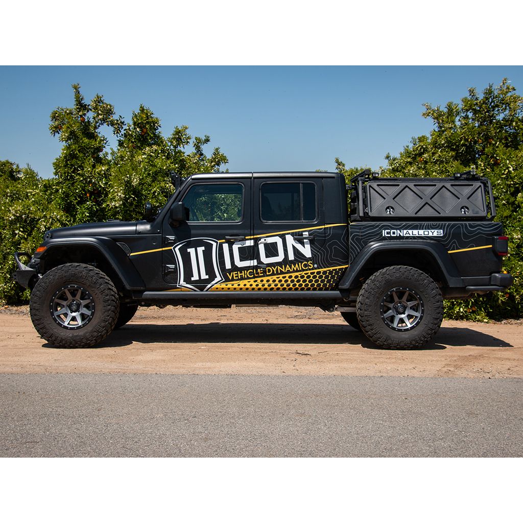Through an accelerated testing process dubbed the “ICON1K” R&D program, ICON has logged over a thousand miles in the dirt pushing the JT to off-road extremes to identify limiting factors in OE components, develop products that remove these limits, and further extrapolate performance out of this vehicle. This 2” suspension system has been tweaked, tuned, and revised several times over the course of this ICON1K testing in an effort to provide unparalleled ride quality and vehicle dynamics for everything from rock crawling to high-speed desert running. By removing the aforementioned “limiting factors” this ICON suspension system completely redefines the potential of the 2020-2023 Jeep Gladiator with wheel travel gains over 30%!