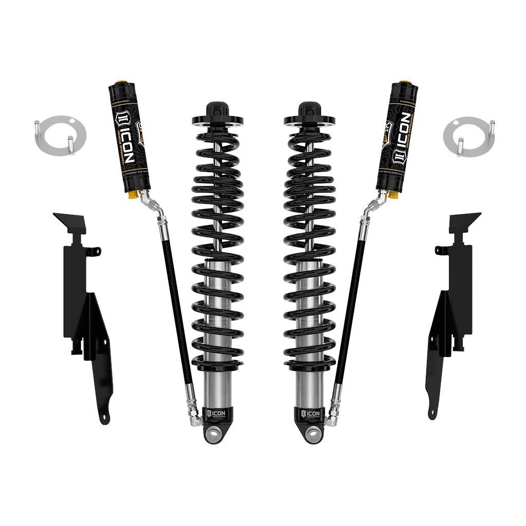 ICON Vehicle Dynamics V.S. 2.5 Series remote reservoir rear coilover shocks with CDCV are an incredible upgrade for the rear end of the 2021-2023 Ford Bronco. These adjustable coilovers allow up to 2-3” of rear lift height adjustability on 4-door Broncos without the Sasquatch package or 1.25-2.25” of rear lift over stock 4-door Sasquatch equipped Broncos, allowing the use of larger, more aggressive wheel and tire combinations. ICON’s Vehicle-specific shock length and valving along with the larger 2.5” shock body and increased piston area over stock components yield the maximum travel possible along with superior ride quality and suspension performance both on- and off-road. Reservoirs greatly increase shock oil volume and heat dissipation surface area to resist overheating and cavitation under hard use, which can lead to damper fade. ICON's exclusive Compression Damping Control Valves are included for precisely dialing in your suspension performance. CDCV controls fluid flow under compression, allowing you to achieve the perfect tune whether driving on the street, slow-crawling through the rocks or mobbing across the desert at full throttle. These rear coilovers are mounted in a shaft up orientation and feature unique ICON engineered progressive dual rate coil springs that provide extra weight capacity for those who frequently load out their Broncos with extra gear and equipment while maintaining excellent on- and off-road performance characteristics. This shaft up orientation also requires the reservoir hose to be routed along the rear lower links so ICON offers hose bracket options for the OE or ICON tubular links while ICON billet links incorporate this bracketry into their design. When paired with ICON 2.5 Series front coilovers vehicle control will be balanced front to rear, resulting in the best overall driving experience for your Ford Bronco.