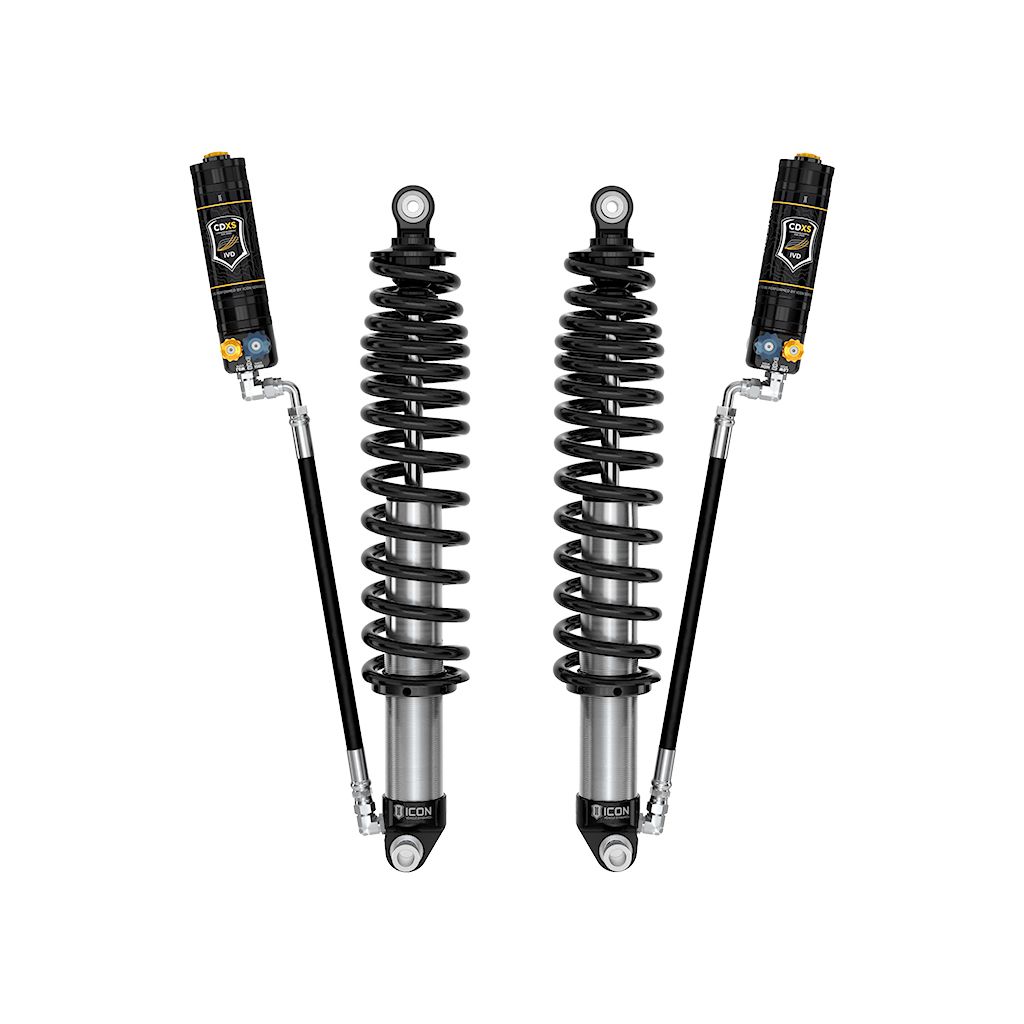 ICON Vehicle Dynamics V.S. 2.5 Series remote reservoir rear coilover shocks with CDCV are an incredible upgrade for the rear end of the 2021-2023 Ford Bronco. These adjustable coilovers allow up to 2-3” of rear lift height adjustability on 4-door Broncos without the Sasquatch package or 1.25-2.25” of rear lift over stock 4-door Sasquatch equipped Broncos, allowing the use of larger, more aggressive wheel and tire combinations. ICON’s Vehicle-specific shock length and valving along with the larger 2.5” shock body and increased piston area over stock components yield the maximum travel possible along with superior ride quality and suspension performance both on- and off-road. Reservoirs greatly increase shock oil volume and heat dissipation surface area to resist overheating and cavitation under hard use, which can lead to damper fade. ICON's exclusive Compression Damping Dual Speed (CDXS) valves are included for precisely dialing in your suspension performance. CDXS controls fluid flow under compression, with independent adjustability of high speed and low speed compression force. 10 discreet detented settings for both low and high-speed adjustment knobs allow separate adjustments for handling response and overall aggressiveness. These rear coilovers are mounted in a shaft up orientation and feature unique ICON engineered progressive dual rate coil springs that provide extra weight capacity for those who frequently load out their Broncos with extra gear and equipment while maintaining excellent on- and off-road performance characteristics. This shaft up orientation also requires the reservoir hose to be routed along the rear lower links so ICON offers hose bracket options for the OE or ICON tubular links while ICON billet links incorporate this bracketry into their design. When paired with ICON 2.5 Series front coilovers vehicle control will be balanced front to rear, resulting in the best overall driving experience for your Ford Bronco.