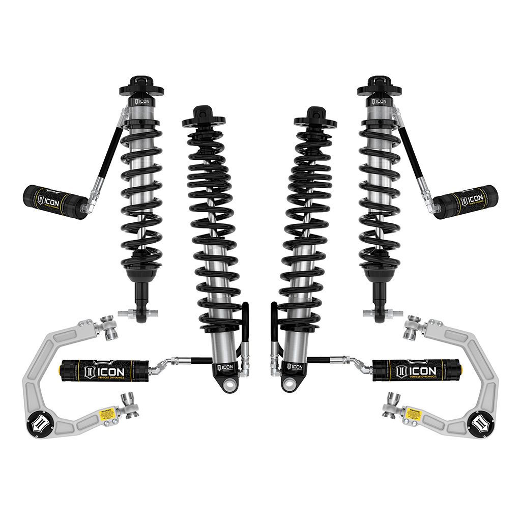 The ICON Vehicle Dynamics Stage 4 Suspension System for the 2021-2023 Ford Bronco features our precision-manufactured, custom valved remote reservoir coilover shocks to yield the maximum travel possible along with superior ride quality and suspension performance both on and off-road. These coilovers also allow for the adjustment of ride height to yield 2-3” of front lift and 1.25-2.25” of rear lift over stock 4-door Broncos with the Sasquatch Package. To provide for sustained shock performance at speed through rough terrain, Stage 4 adds remote reservoirs to the ICON Coilovers. Remote reservoirs greatly increase shock oil volume and heat dissipation surface area to resist overheating and cavitation under hard use, which can lead to damper fade. To accommodate the increased travel and lift height afforded by the ICON Coilovers, this Stage 4 kit comes with Billet Aluminum Upper Control Arms which provide on-vehicle caster and camber adjustability and feature our patented Delta Joint PRO, which allows for up to 90-desgrees freedom of movement. The rear coilovers are mounted in a shaft up orientation and feature unique ICON engineered progressive dual rate coil springs that provide extra weight capacity for those who frequently load out their Broncos with extra gear and equipment while maintaining excellent on- and off-road performance characteristics. This suspension system is designed to provide up to 11.5" of front suspension travel and 14" of rear suspension travel when used with 35X12.50 tires. It may be safely used with 37" and larger tires if using the optional up-travel limiters (sold separately).