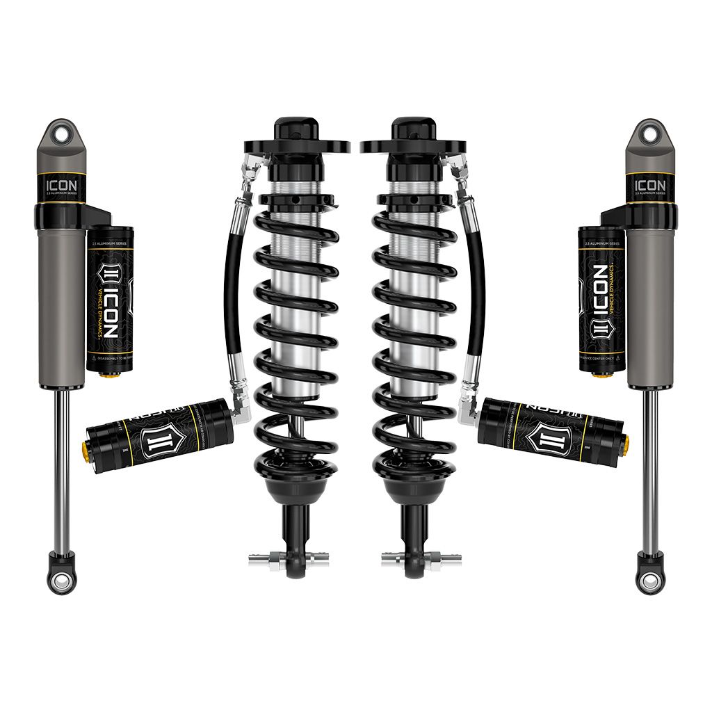 ICON Vehicle Dynamics 2021-2024 Ford F-150 4WD suspension systems are designed with maximum performance and the serious driver in mind. ICON engineers’ primary focus is to increase wheel travel and damping ability, which translates into outstanding vehicle control and ride quality both on and off-road. The Stage 3 system includes vehicle-specific tuned 2.5” coilover shocks featuring remote reservoirs for exceptional cooling properties and ICON-engineered Eibach coil springs for superior vehicle “feel” through the range of travel. These coilovers are also height adjustable from 0-2.75” allowing the use of larger, more aggressive wheel and tire combinations. ICON 2.5 Aluminum Series piggyback reservoir rear shocks utilize a vehicle-specific valving that balances the performance of the truck from front to rear. The ICON Vehicle Dynamics 2021-2024 F-150 4WD Stage 3 suspension system is an excellent choice for those drivers looking to enhance the capabilities of their pickup on the road as well as in the dirt.