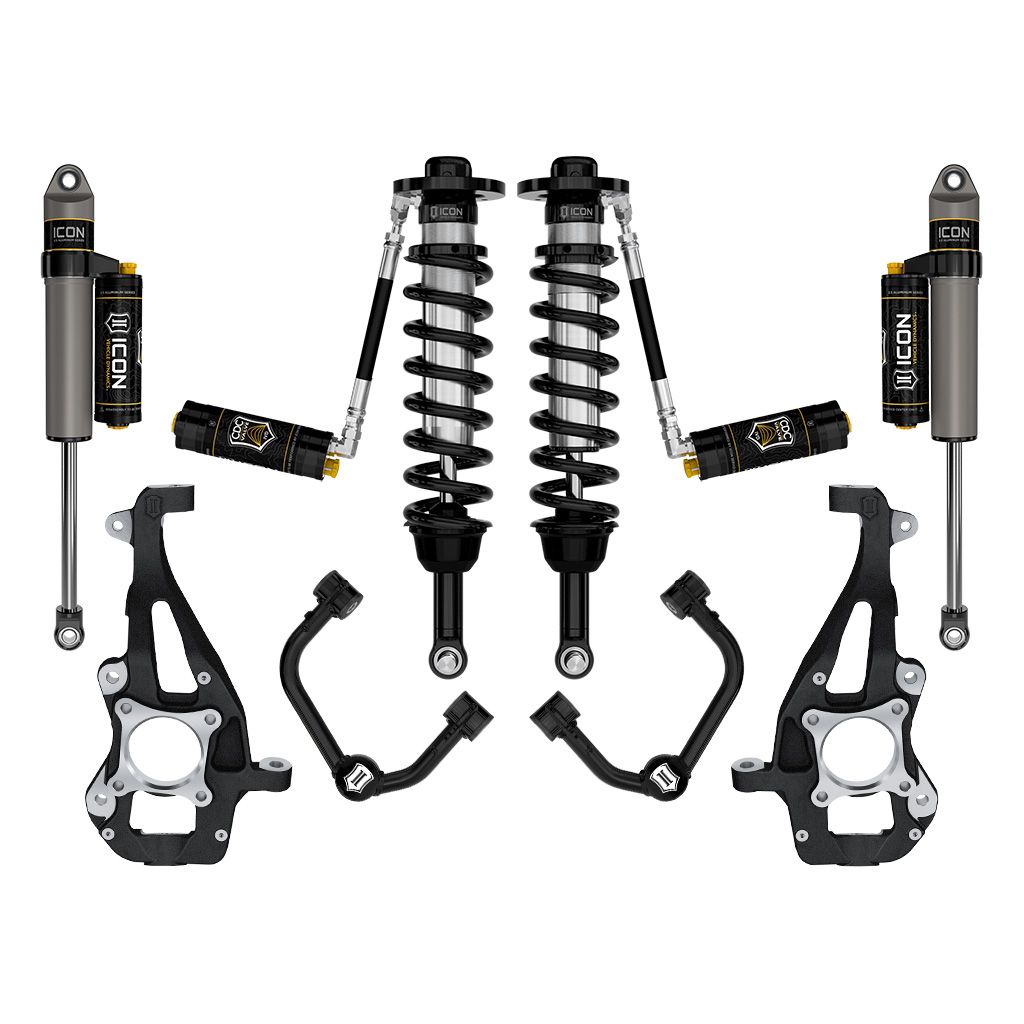This system features upper control arms with ICON's patented Delta Joint PRO. Delta Joint PRO is ICON's innovative new suspension articulation joint which combines the durability and longevity of factory style ball joints with performance and strength that exceeds traditional motorsports-style ball joints. The Delta Joint PRO features a new rebuildable, serviceable design in which any component may be removed, inspected, and replaced without having to purchase a whole new joint. Strength and durability are improved by using a larger ball with 56% more bearing surface than our standard Delta Joint, along with improved lubrication sealing. But improved performance is at the heart of the Delta Joint PRO, with a full 90 degrees of articulation, from one extreme to the other. This represents a 14% improvement in range of motion, over the highly capable original Delta Joint, allowing for maximum bind-free suspension movement through the complete range of travel. The Delta Joint PRO is built to take the abuse, with a chromoly ball and shaft that has a bearing surface hardened to Rockwell C 55. The replaceable races are made of graphite-impregnated sintered metal, machined to the finest tolerance to provide a flawless, metal-to-metal bearing interface. We also redesigned the lubrication system, with lubricant channels that distribute grease more efficiently without extending past the bearing seal.