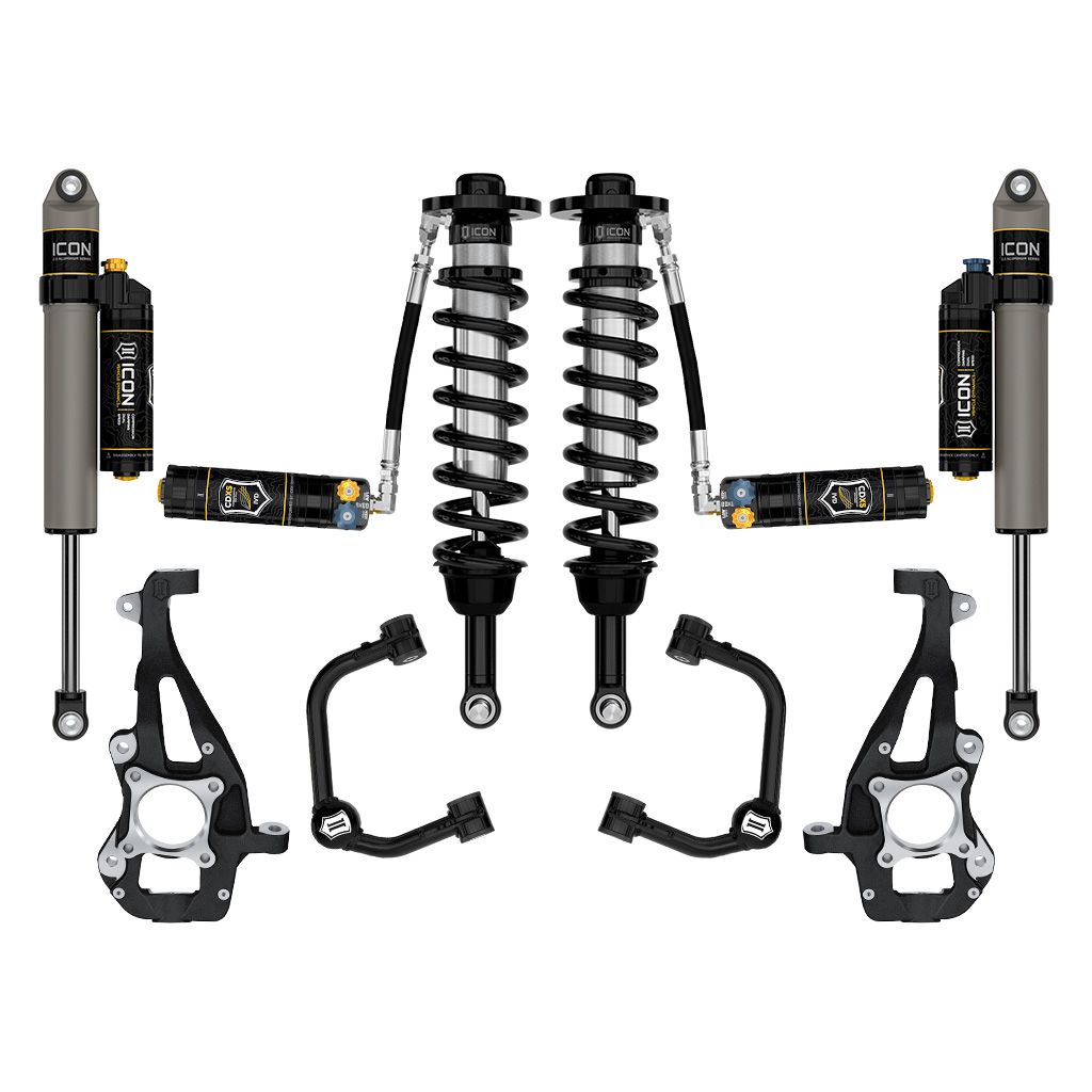 This system features upper control arms with ICON's patented Delta Joint PRO. Delta Joint PRO is ICON's innovative new suspension articulation joint which combines the durability and longevity of factory style ball joints with performance and strength that exceeds traditional motorsports-style ball joints. The Delta Joint PRO features a new rebuildable, serviceable design in which any component may be removed, inspected, and replaced without having to purchase a whole new joint. Strength and durability are improved by using a larger ball with 56% more bearing surface than our standard Delta Joint, along with improved lubrication sealing. But improved performance is at the heart of the Delta Joint PRO, with a full 90 degrees of articulation, from one extreme to the other. This represents a 14% improvement in range of motion, over the highly capable original Delta Joint, allowing for maximum bind-free suspension movement through the complete range of travel. The Delta Joint PRO is built to take the abuse, with a chromoly ball and shaft that has a bearing surface hardened to Rockwell C 55. The replaceable races are made of graphite-impregnated sintered metal, machined to the finest tolerance to provide a flawless, metal-to-metal bearing interface. We also redesigned the lubrication system, with lubricant channels that distribute grease more efficiently without extending past the bearing seal.