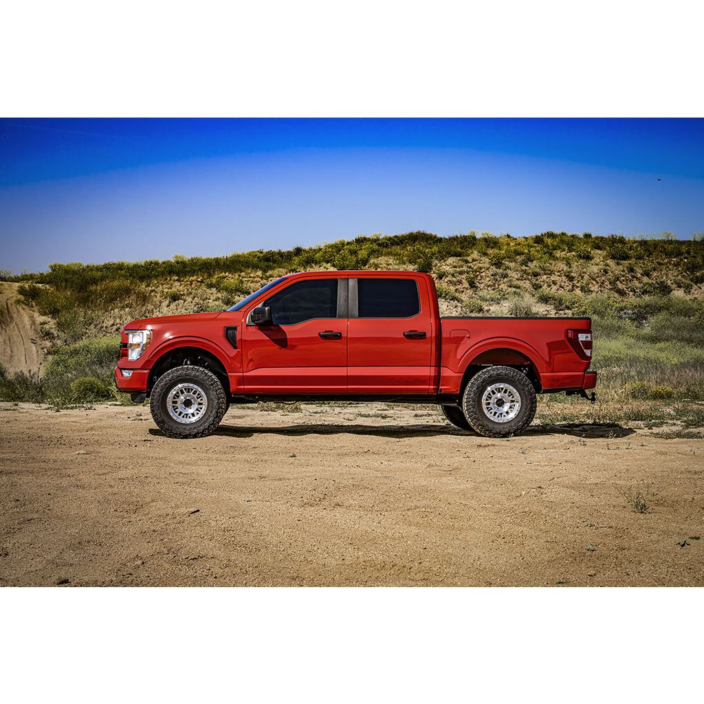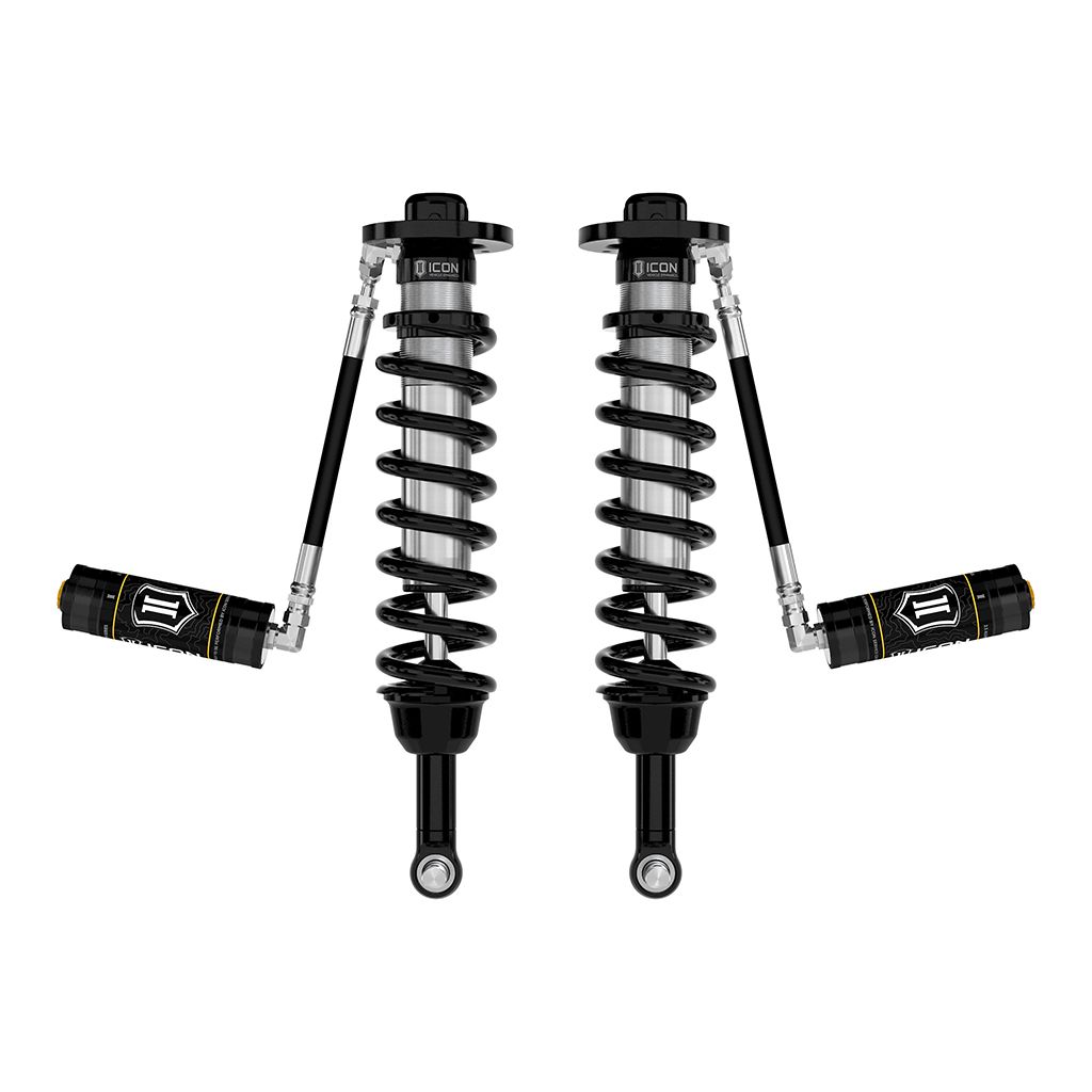 ICON Vehicle Dynamics V.S. Series 2.5” coilover shocks are an incredible upgrade for the front end of 2021-2024 Ford F-150 Tremor and F-150 4WD trucks equipped with ICON's Front Knuckle Kit. These coilovers feature an application specific length for F-150 Tremor or other F-150 sub-models equipped with ICON’s Front Knuckle Kit, allowing the most wheel travel possible as well as a taller lift height range than other ICON coilover options. ICON’s Vehicle-specific valving provides a sport tuned feel on and off-road while 2.5-3” of lift height adjustability on F-150 Tremor or 3.5-4.5” of lift height adjustability on other F-150 sub-models allow the use of larger, more aggressive wheel and tire combinations. The larger 2.5” shock body and increased piston area over stock components provides improved damping ability and outstanding ride characteristics across varying types of terrain. Remote reservoirs greatly increase shock oil volume and heat dissipation surface area to resist overheating and cavitation under hard use, which can lead to damper fade. When paired with ICON rear 2.0 Aluminum Series or 2.5 Aluminum Series shocks, vehicle control will be balanced front to rear, resulting in the best overall driving experience for your F-150.