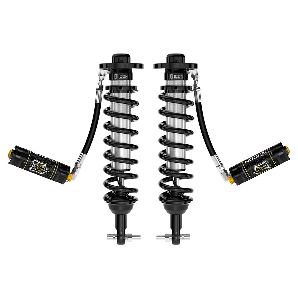 ICON Vehicle Dynamics V.S. Series 2.5” coilover shocks are an incredible upgrade for the front end of 2021-2024 Ford F-150 Tremor and F-150 4WD trucks equipped with ICON's Front Knuckle Kit. These coilovers feature an application specific length for F-150 Tremor or other F-150 sub-models equipped with ICON’s Front Knuckle Kit, allowing the most wheel travel possible as well as a taller lift height range than other ICON coilover options. ICON’s Vehicle-specific valving provides a sport tuned feel on and off-road while 2.5-3” of lift height adjustability on F-150 Tremor or 3.5-4.5” of lift height adjustability on other F-150 sub-models allow the use of larger, more aggressive wheel and tire combinations. The larger 2.5” shock body and increased piston area over stock components provides improved damping ability and outstanding ride characteristics across varying types of terrain. Remote reservoirs greatly increase shock oil volume and heat dissipation surface area to resist overheating and cavitation under hard use, which can lead to damper fade. ICON's exclusive Compression Damping Control Valves are included for precisely dialing in your suspension performance. CDCV controls fluid flow under compression, allowing you to achieve the perfect tune whether driving on the street, slow-crawling through the rocks or mobbing across the desert at full throttle. When paired with ICON rear 2.0 Aluminum Series or 2.5 Aluminum Series shocks, vehicle control will be balanced front to rear, resulting in the best overall driving experience for your F-150.