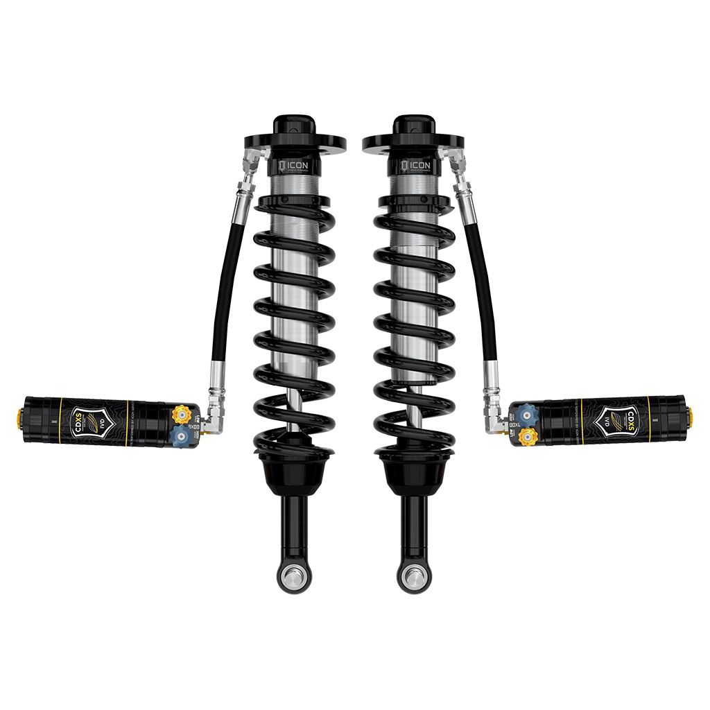 ICON Vehicle Dynamics V.S. Series 2.5” coilover shocks are an incredible upgrade for the front end of 2021-2024 Ford F-150 Tremor and F-150 4WD trucks equipped with ICON's Front Knuckle Kit. These coilovers feature an application specific length for F-150 Tremor or other F-150 sub-models equipped with ICON’s Front Knuckle Kit, allowing the most wheel travel possible as well as a taller lift height range than other ICON coilover options. ICON’s Vehicle-specific valving provides a sport tuned feel on and off-road while 2.5-3” of lift height adjustability on F-150 Tremor or 3.5-4.5” of lift height adjustability on other F-150 sub-models allow the use of larger, more aggressive wheel and tire combinations. The larger 2.5” shock body and increased piston area over stock components provides improved damping ability and outstanding ride characteristics across varying types of terrain. Remote reservoirs greatly increase shock oil volume and heat dissipation surface area to resist overheating and cavitation under hard use, which can lead to damper fade. ICON's exclusive Compression Damping Dual Speed (CDXS) valves are included for precisely dialing in your suspension performance. CDXS controls fluid flow under compression, with independent adjustability of high speed and low speed compression force. 10 discreet detented settings for both low and high-speed adjustment knobs allow separate adjustments for handling response and overall aggressiveness. When paired with ICON rear 2.0 Aluminum Series or 2.5 Aluminum Series shocks, vehicle control will be balanced front to rear, resulting in the best overall driving experience for your F-150.