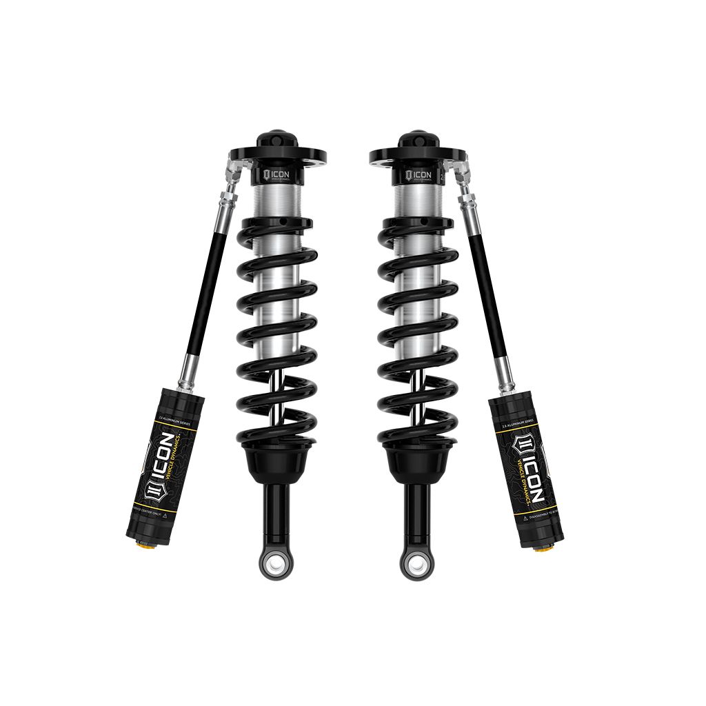 ICON Vehicle Dynamics V.S. 2.5 Series remote reservoir front coilover shocks are an incredible upgrade for the front end of the 2022-2024 Toyota Tundra. These adjustable coilovers are specifically designed for use the ICON 6" Lift Performance Suspension System and allow up to 5-6” of front lift height adjustability, allowing the use of larger, more aggressive wheel and tire combinations. ICON’s Vehicle-specific shock length and valving along with the larger 2.5” shock body and increased piston area over stock components yield the maximum travel possible along with superior ride quality and suspension performance both on- and off-road. Reservoirs greatly increase shock oil volume and heat dissipation surface area to resist overheating and cavitation under hard use, which can lead to damper fade. When paired with ICON 2.0 or 2.5 Aluminum Series rear shock absorbers vehicle control will be balanced front to rear, resulting in the best overall driving experience for your Toyota Tundra.