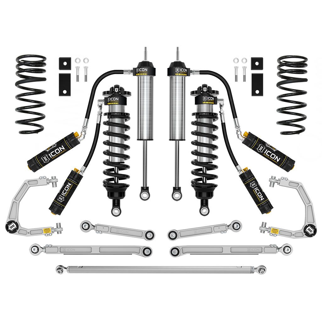 Stage 3 includes 3.0 remote res coilovers for 1.25-3.25” of lift, max performance and 35” tire fitment. Billet UCAs, links, rear coils, track bar and 3.0 Series remote res shocks balance shock damping. CDCV for damping adjustment.