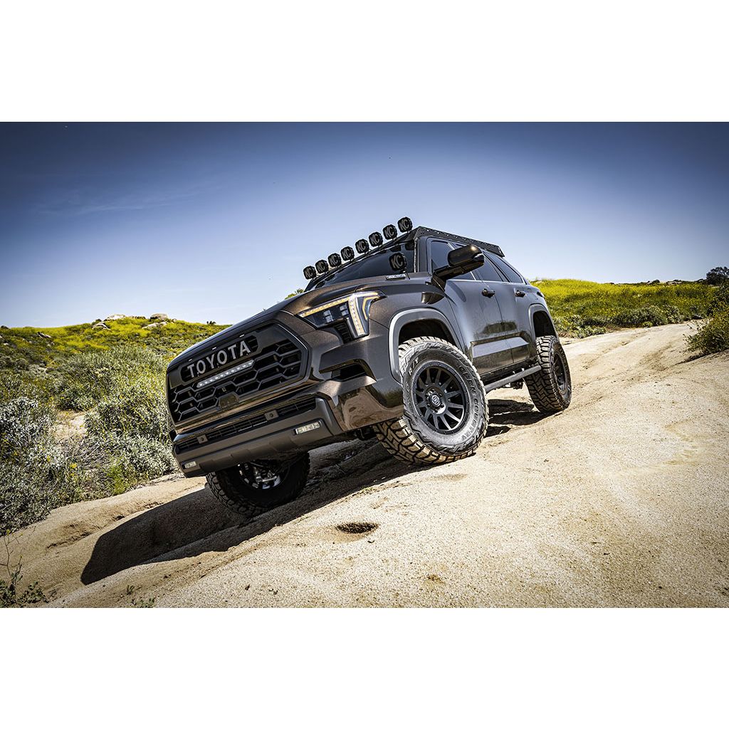 ICON Vehicle Dynamics V.S. 2.5 Series remote reservoir front coilover shocks are an incredible upgrade for the front end of the 2022-2025 Toyota Tundra or 2023-2025 Toyota Sequoia. These adjustable coilovers allow up to 1.25-3.5” of lift height adjustability on Tundra or 3.5-4.5" of front lift on Sequoia, allowing the use of larger, more aggressive wheel and tire combinations. ICON’s Vehicle-specific shock length and valving along with the larger 2.5” shock body and increased piston area over stock components yield the maximum travel possible along with superior ride quality and suspension performance both on- and off-road. Reservoirs greatly increase shock oil volume and heat dissipation surface area to resist overheating and cavitation under hard use, which can lead to damper fade. ICON's exclusive Compression Damping Control Valves are included for precisely dialing in your suspension performance. CDCV controls fluid flow under compression, allowing you to achieve the perfect tune whether driving on the street, slow-crawling through the rocks or mobbing across the desert at full throttle. When paired with ICON 2.0 or 2.5 Aluminum Series rear coilovers vehicle control will be balanced front to rear, resulting in the best overall driving experience for your Toyota Tundra or Sequoia.