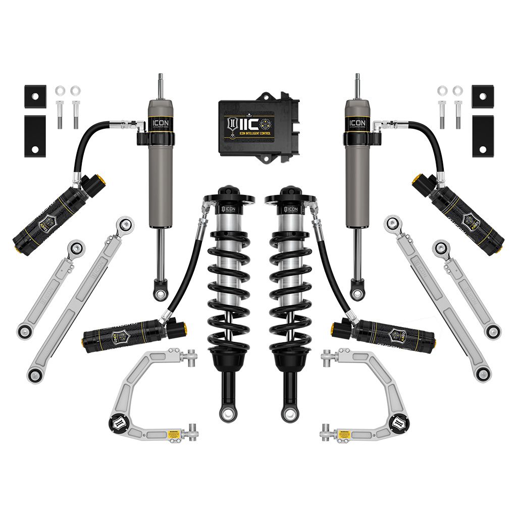 Stage 13 includes remote reservoir coilovers for 1.25-3.5” of front lift, better performance and 35” tire fitment. Billet UCAs, links and 2.5 Series remote reservoir shocks for balanced shock tuning. CDEV for active damping adjustment.