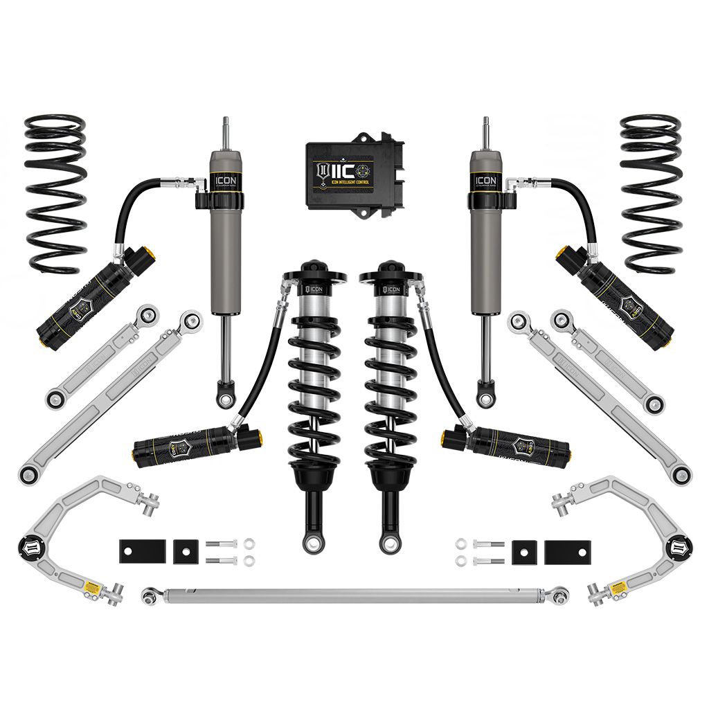 Stage 14 includes remote res coilovers for 1.25-3.5” of lift, performance and 35” tire fitment. Billet UCAs, links, rear coils, track bar, and 2.5 Series remote reservoir shocks for balanced shock tuning. CDEV for active damping adjustment.