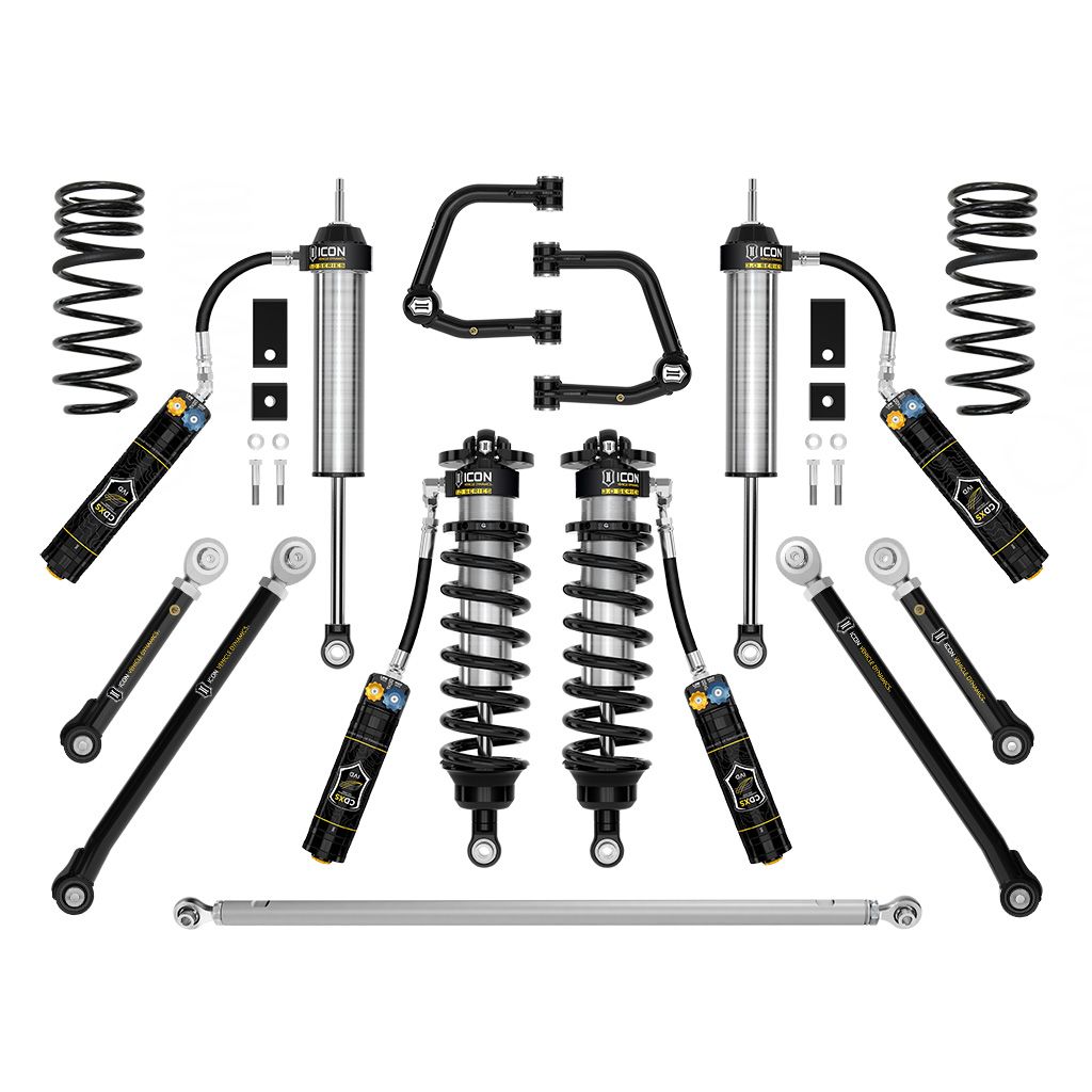 Stage 3 includes 3.0 remote res coilovers for 1.25-3.25” of lift, max performance and 35” tire fitment. Tubualr UCAs, links, rear coils, track bar and 3.0 Series remote res shocks balance shock damping. CDXS for damping adjustment.