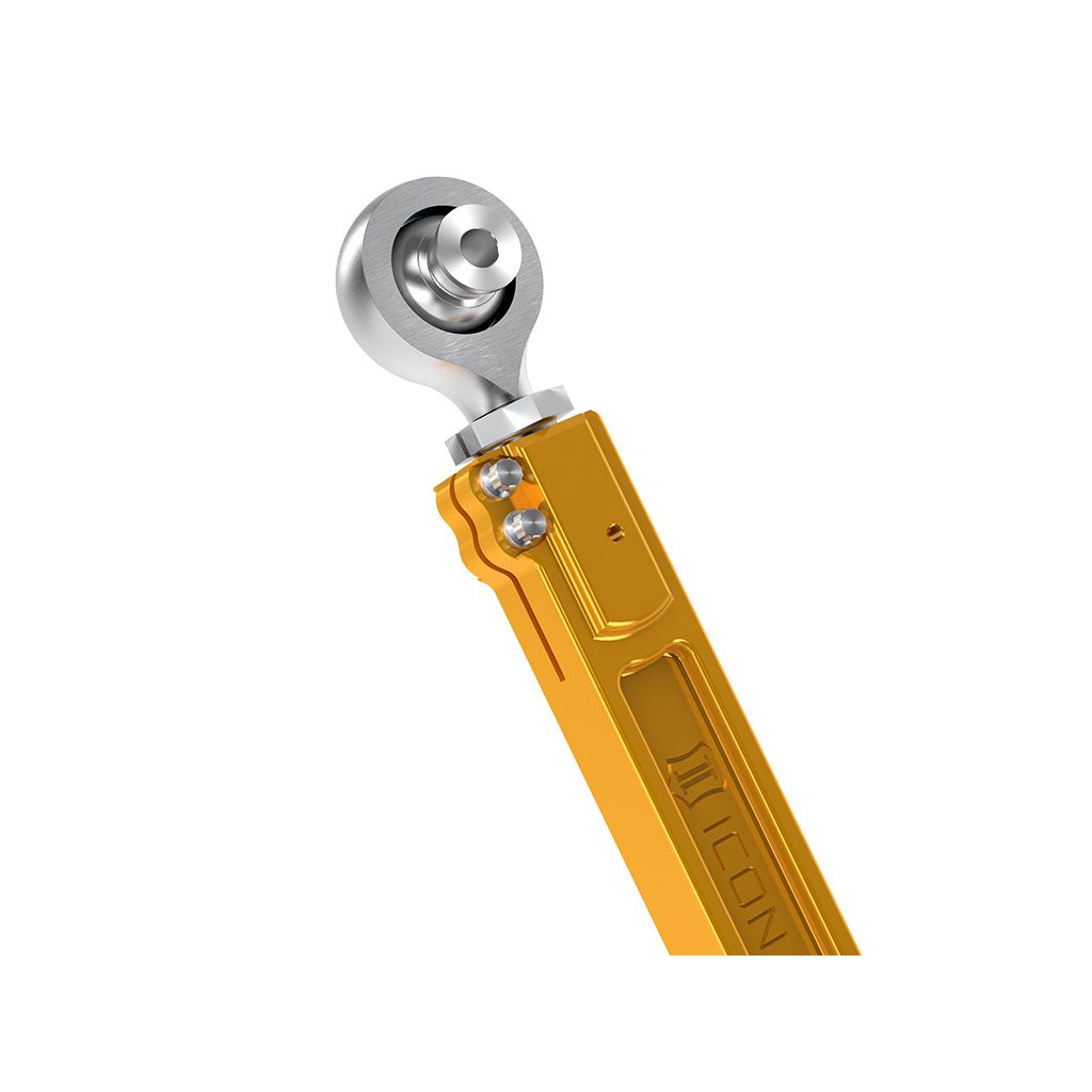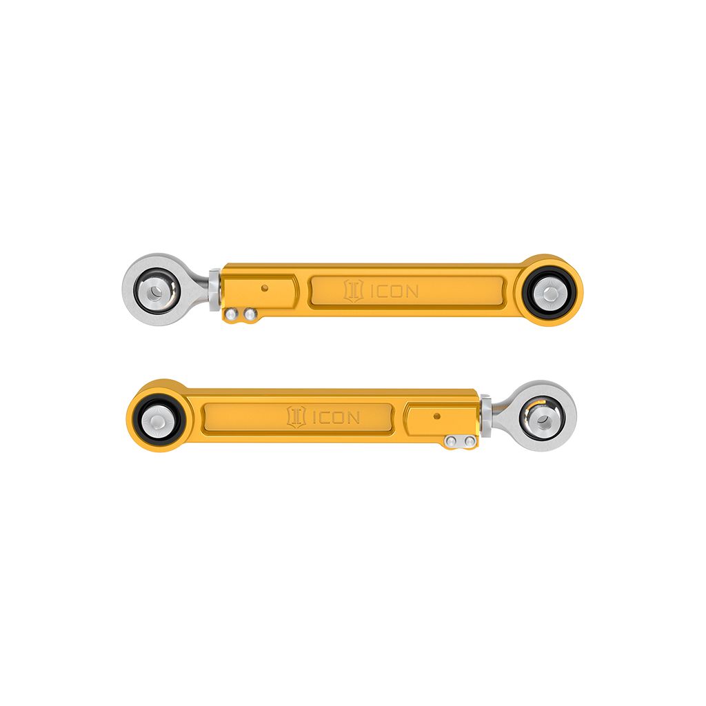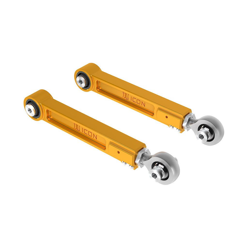 ICON’s billet aluminum rear upper link arms for the 2022-2025 Toyota Tundra, 2023-2025 Toyota Sequoia, 2024-2025 Toyota Tacoma, 2024-2025 Toyota Land Cruiser 250 Series, 2025 Toyota 4Runner, and 2024-2025 Lexus GX550 are a significant upgrade over the factory units due to increases in strength, adjustability, and performance. These links are made from CNC machined 6061 aluminum in-house and anodized for corrosion resistance, providing a major improvement over the construction of the stock units. An all-new gold anodized finish matches ICON shock absorbers for a splash of color in the wheel well and provide a custom look to any build. This rear upper link arm kit features PTFE-lined FK rod ends for increased suspension articulation, reduced deflection, and on-vehicle link arm length adjustability using ICON’s double adjuster system. Additionally, multi durometer bushings are installed that allow for noise free operation and maximum angularity without the need for periodic greasing and/or other maintenance. The quality rod ends and bushings featured in these link arms allow the vehicle’s suspension to function as intended, without the bushing bind that limits the vehicle in stock form. After the design phase was completed ICON engineers put these parts through the “ICON1K” real-world test cycle for a final stamp of approval.