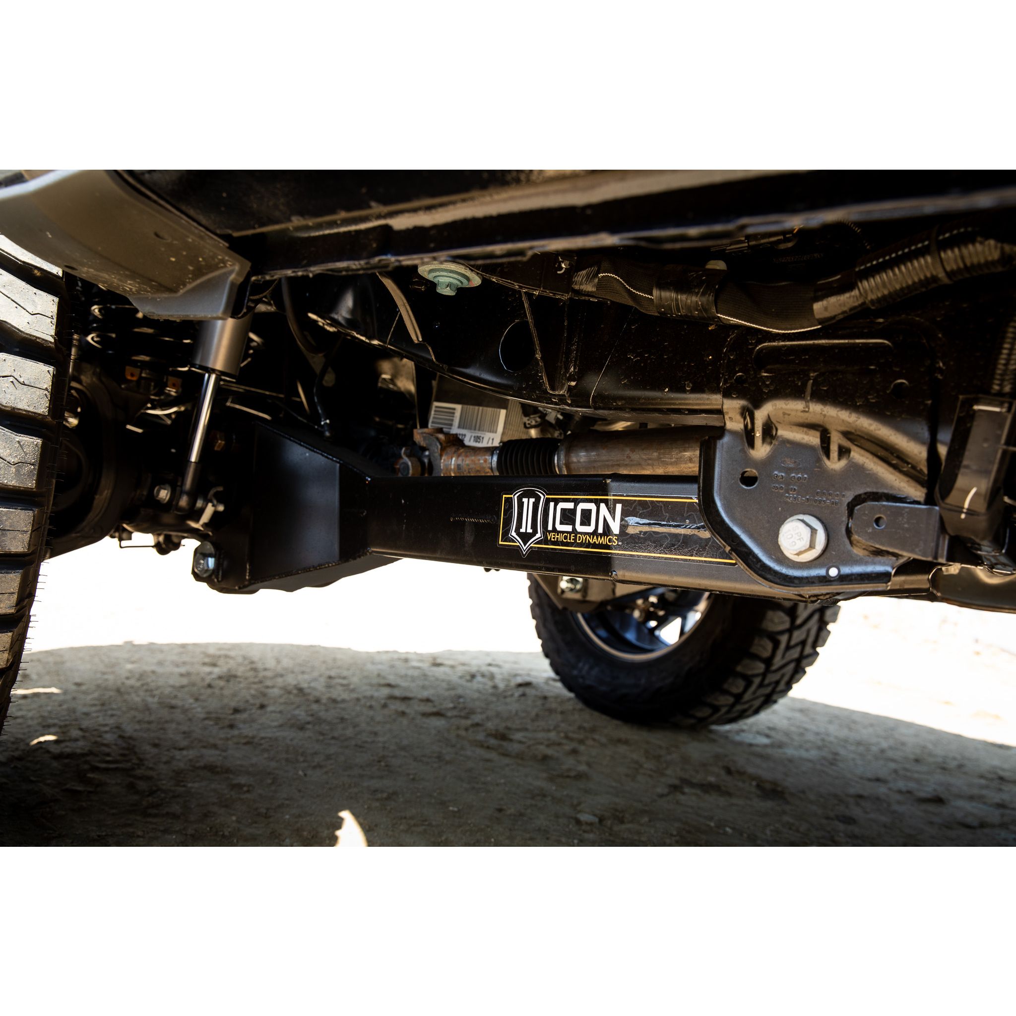 This ICON Vehicle Dynamics 2.5-3” coilover system is a great way to lift your 4WD 2023-2025 Ford F-250/F-350 Super Duty while drastically improving ride quality and performance. The Stage 1 system is perfect for on-road and light duty off-road use including towing, job site duty and general off-road adventure. The advantage of utilizing a coilover conversion kit is that they have been designed to increase the overall damping ability of the vehicle while at the same time allowing for user-defined ride height adjustment. The 2.5" Remote Reservoir Coilover featured in these kits is based off of ICON’s 2.5 VS Series shock line – meaning that features like ICON engineered coil springs, FK Rod End bearings, and vehicle-specific valving come standard. ICON's Stage 1 System is comprised of ICON 2.5 Series remote reservoir coilovers with adjustable ride height, fabricated Radius arms, and ICON 2.0 Aluminum Series internal reservoir rear shocks. This stage sees the inclusion of the ICON Vehicle Dynamics Ford Super Duty Radius Arm System that feature a sealed pivot bushing that minimizes road feedback and ensures a long life and quiet operation. Additionally, their fabricated, fully boxed design ensures strength and utilizes a profile optimized for tire clearance at full steering lock, making a 37” tall tire clear without coming in contact with the radius arm. With the endless hours ICON has spent testing and tuning our suspension components and shocks as a complete package, you can rest assured you have the best suspension solution on the market.