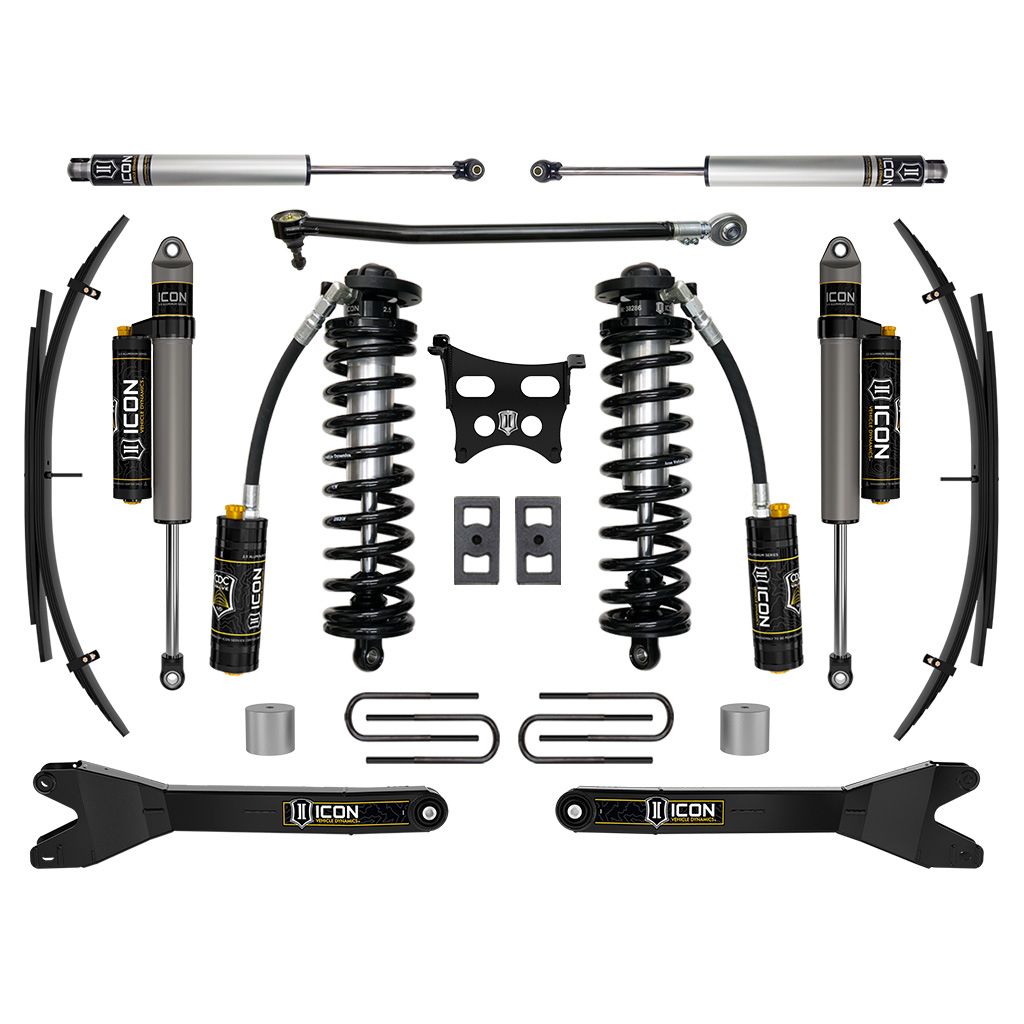 This ICON Vehicle Dynamics 2.5-3” coilover system is a great way to lift your 4WD 2023-2025 Ford F-250/F-350 Super Duty while drastically improving ride quality and performance. The Stage 4 system is perfect for on-road and off-road use including towing, job site duty and general off-road adventure. The advantage of utilizing a coilover conversion kit is that they have been designed to increase the overall damping ability of the vehicle while at the same time allowing for user-defined ride height adjustment. The 2.5" Remote Reservoir Coilover featured in these kits is based off ICON’s 2.5 VS Series shock line – meaning that features like ICON engineered coil springs, FK Rod End bearings, and vehicle-specific valving come standard. ICON's Stage 4 System is comprised of ICON 2.5 Series CDCV remote reservoir coilovers with adjustable ride height, dual steering stabilizer kit with ICON 2.0 Aluminum Series stabilizers, rear leaf spring expansion packs with blocks and U-bolts for a more compliant ride and reduced axle wrap, and ICON 2.5 Aluminum Series CDCV piggyback reservoir rear shocks, for those desiring an easy way to tune the ride externally with 10 settings, from soft to hard. This stage sees the inclusion of the ICON Vehicle Dynamics Ford Super Duty Radius Arm System that feature a sealed pivot bushing that minimizes road feedback and ensures a long life and quiet operation. Additionally, their fabricated, fully boxed design ensures strength and utilizes a profile optimized for tire clearance at full steering lock, making a 37” tall tire clear without coming in contact with the radius arm. With the endless hours ICON has spent testing and tuning our suspension components and shocks as a complete package, you can rest assured you have the best suspension solution on the market.