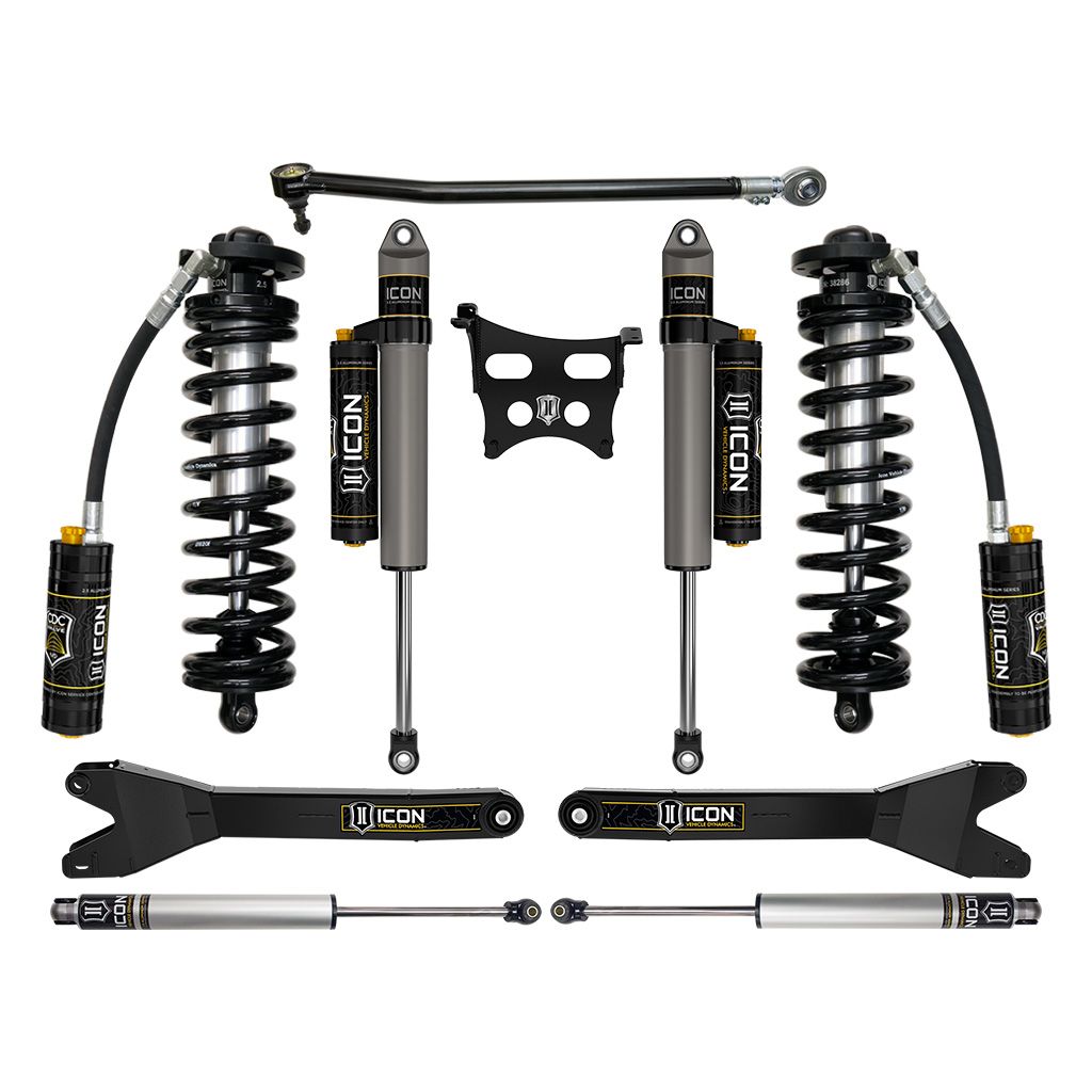 This ICON Vehicle Dynamics 2.5-3” coilover system is a great way to lift your 4WD 2023-2025 Ford F-250/F-350 Super Duty while drastically improving ride quality and performance. The Stage 4 system is perfect for on-road and off-road use including towing, job site duty and general off-road adventure. The advantage of utilizing a coilover conversion kit is that they have been designed to increase the overall damping ability of the vehicle while at the same time allowing for user-defined ride height adjustment. The 2.5" Remote Reservoir Coilover featured in these kits is based off ICON’s 2.5 VS Series shock line – meaning that features like ICON engineered coil springs, FK Rod End bearings, and vehicle-specific valving come standard. ICON's Stage 4 System is comprised of ICON 2.5 Series CDCV remote reservoir coilovers with adjustable ride height, dual steering stabilizer kit with ICON 2.0 Aluminum Series stabilizers, on-vehicle adjustable front track bar, fabricated radius arms, and ICON CDCV 2.5 Aluminum Series piggyback reservoir rear shocks, for those desiring an easy way to tune the ride externally with 10 settings, from soft to hard. This stage sees the inclusion of the ICON Vehicle Dynamics Ford Super Duty Radius Arm System that feature a sealed pivot bushing that minimizes road feedback and ensures a long life and quiet operation. Additionally, their fabricated, fully boxed design ensures strength and utilizes a profile optimized for tire clearance at full steering lock, making a 37” tall tire clear without coming in contact with the radius arm. With the endless hours ICON has spent testing and tuning our suspension components and shocks as a complete package, you can rest assured you have the best suspension solution on the market.