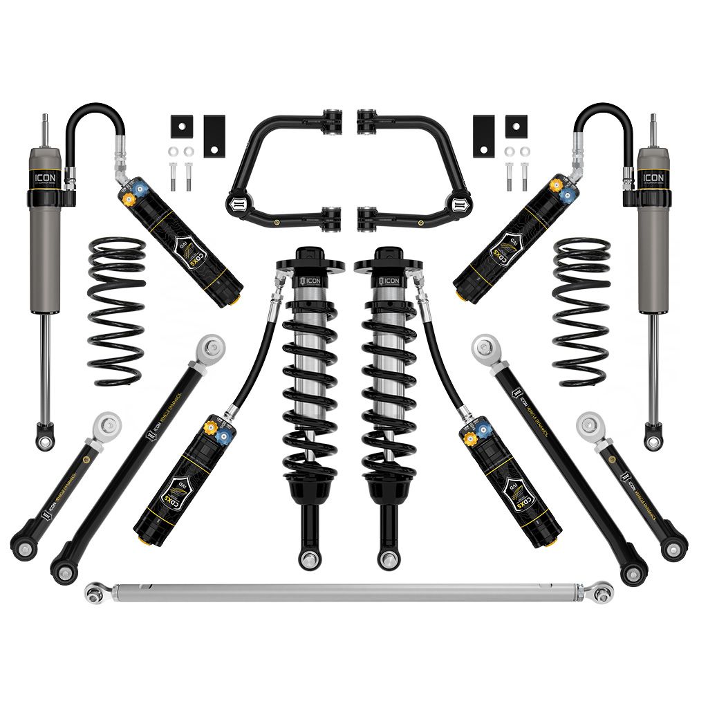 Stage 10 includes 2.5 Series CDXS coilovers for 3-4.5” of front lift, greater performance, and 35” tire fitment. UCAs, rear links and track bar provide alignment correction and rear coils with 2.5 Series CDXS rear shocks balance the tuning.