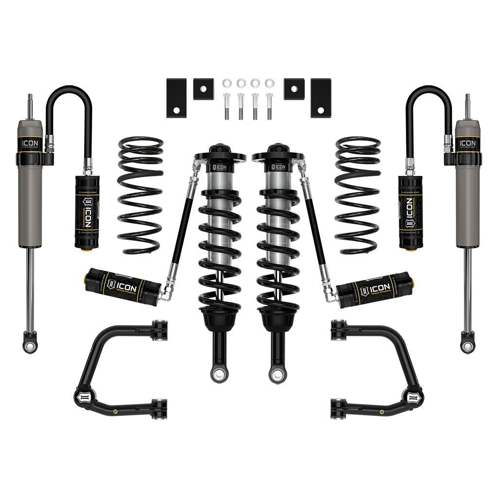Stage 7 includes 2.5 Series remote reservoir coilovers for 3-4.5” of front lift, greater performance, and 35” tire fitment. Tubular UCAs provide alignment correction and rear coils with 2.5 Series remote res rear shocks balance the tuning.