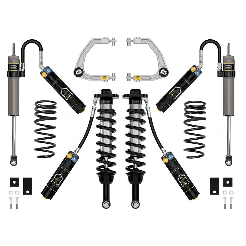 Stage 9 includes 2.5 Series CDXS remote reservoir coilovers for 3-4.5” of front lift, greater performance, and 35” tire fitment. UCAs provide alignment correction and rear coils with 2.5 Series remote CDXS rear shocks balance the tuning.