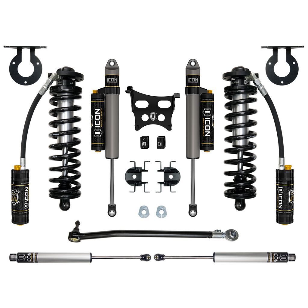 This ICON Vehicle Dynamics 2.5-3” coilover system is a great way to lift your 4WD 2023 Ford F-250/F-350 Super Duty while drastically improving ride quality and performance. The Stage 4 system is perfect for on-road and off-road use including towing, job site duty and general off-road adventure. The advantage of utilizing a coilover conversion kit is that they have been designed to increase the overall damping ability of the vehicle while at the same time allowing for user-defined ride height adjustment. The 2.5" Remote Reservoir Coilover featured in these kits is based off ICON’s 2.5 VS Series shock line – meaning that features like ICON engineered coil springs, FK Rod End bearings, and vehicle-specific valving come standard. ICON's Stage 4 System is comprised of ICON 2.5 Series CDCV remote reservoir coilovers with adjustable ride height, dual steering stabilizer kit with ICON 2.0 Aluminum Series stabilizers, on-vehicle adjustable front track bar, and ICON CDCV 2.5 Aluminum Series piggyback reservoir rear shocks, for those desiring an easy way to tune the ride externally with 10 settings, from soft to hard. With the endless hours ICON has spent testing and tuning our suspension components and shocks as a complete package, you can rest assured you have the best suspension solution on the market.