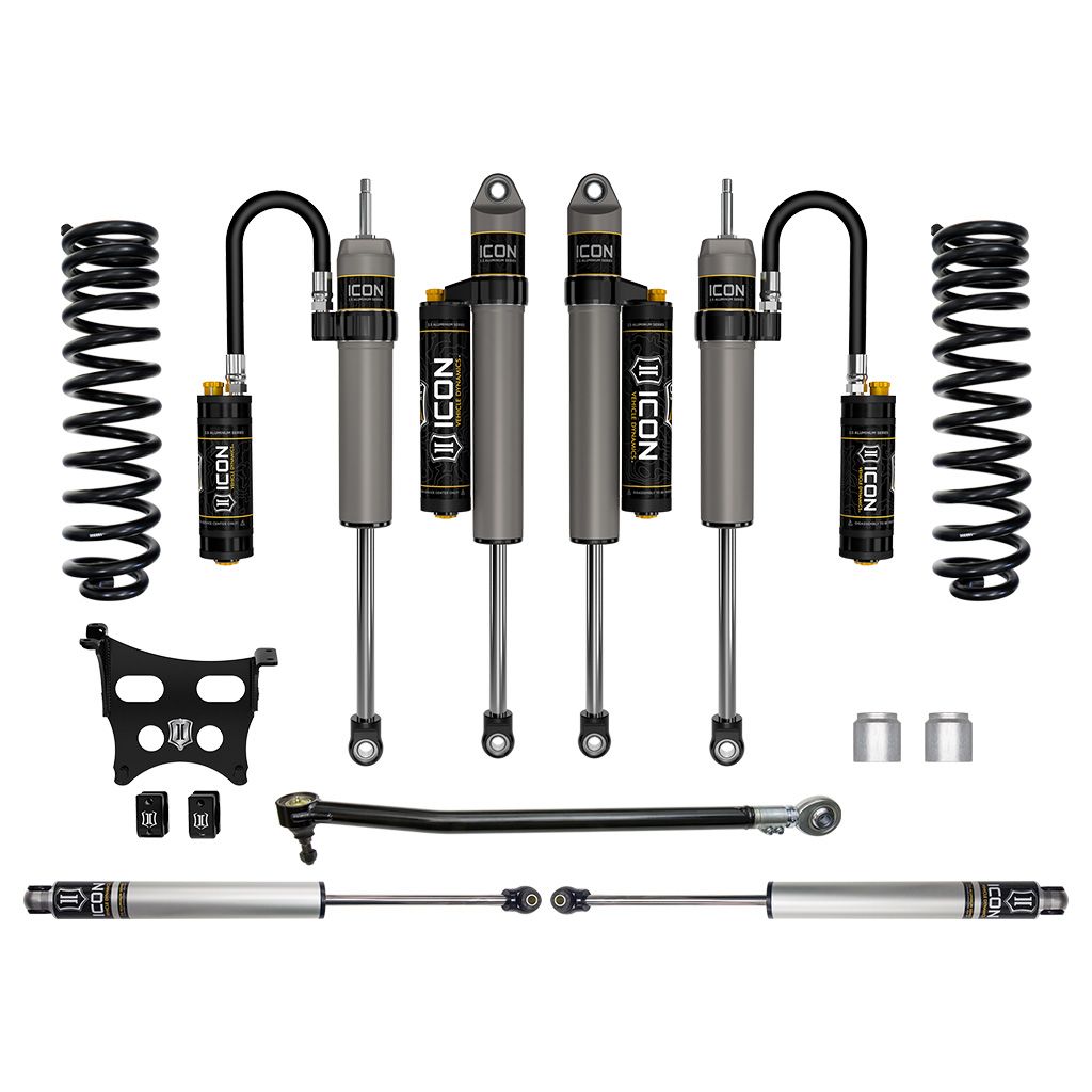 This ICON Vehicle Dynamics 2.5” suspension system is a great way to level your 4WD 2023 Ford F-250/F-350 Super Duty while drastically improving ride quality and performance. The Stage 5 system is perfect for on-road and off-road use including towing, job site duty, and spirited off-road adventure. ICON's Stage 4 System combines dual rate coil springs optimized for trucks equipped with diesel engines, alignment cams, ICON CDC Valve 2.5 Aluminum Series front remote reservoir and rear piggyback reservoir shocks, dual steering stabilizer kit with ICON 2.0 Aluminum Series stabilizers, and an all-new adjustable track bar designed specifically for the 2017-2024 Super Duty, With the endless hours ICON has spent testing and tuning our suspension components and shocks as a complete package, you can be rest assured you have the best suspension solution on the market.