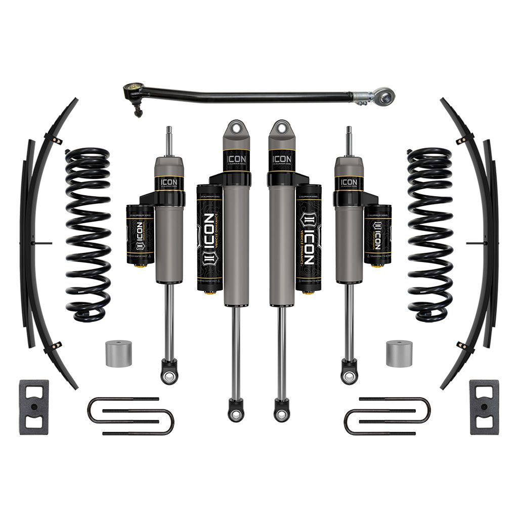 The ICON 2.5” suspension system is a great way to lift your 4WD 2023 Ford F-250/F-350 Super Duty while improving ride quality and performance. This upgraded Stage 3 system is great for towing, rough construction site terrains, and country dirt roads all while keeping a smooth highway feel. ICON's Stage 3 System is comprised of dual rate coil springs optimized for trucks equipped with gasoline engines, 2.5 Aluminum Series piggyback reservoir front and rear shocks, adjustable front track bar with massive FK rod end, alignment cams for adding caster, and rear leaf spring expansion packs with blocks and U-bolts for a more compliant ride and reduced axle wrap. ICON 2.5" piggyback reservoir shocks ensure optimum performance by increasing the duration of consistent damping regardless of situation, keeping the shocks at a cooler operating temperature during heavy use. With the endless hours ICON has spent testing and tuning our suspension components and shocks as a complete package, you can rest assured you have the best suspension solution on the market.