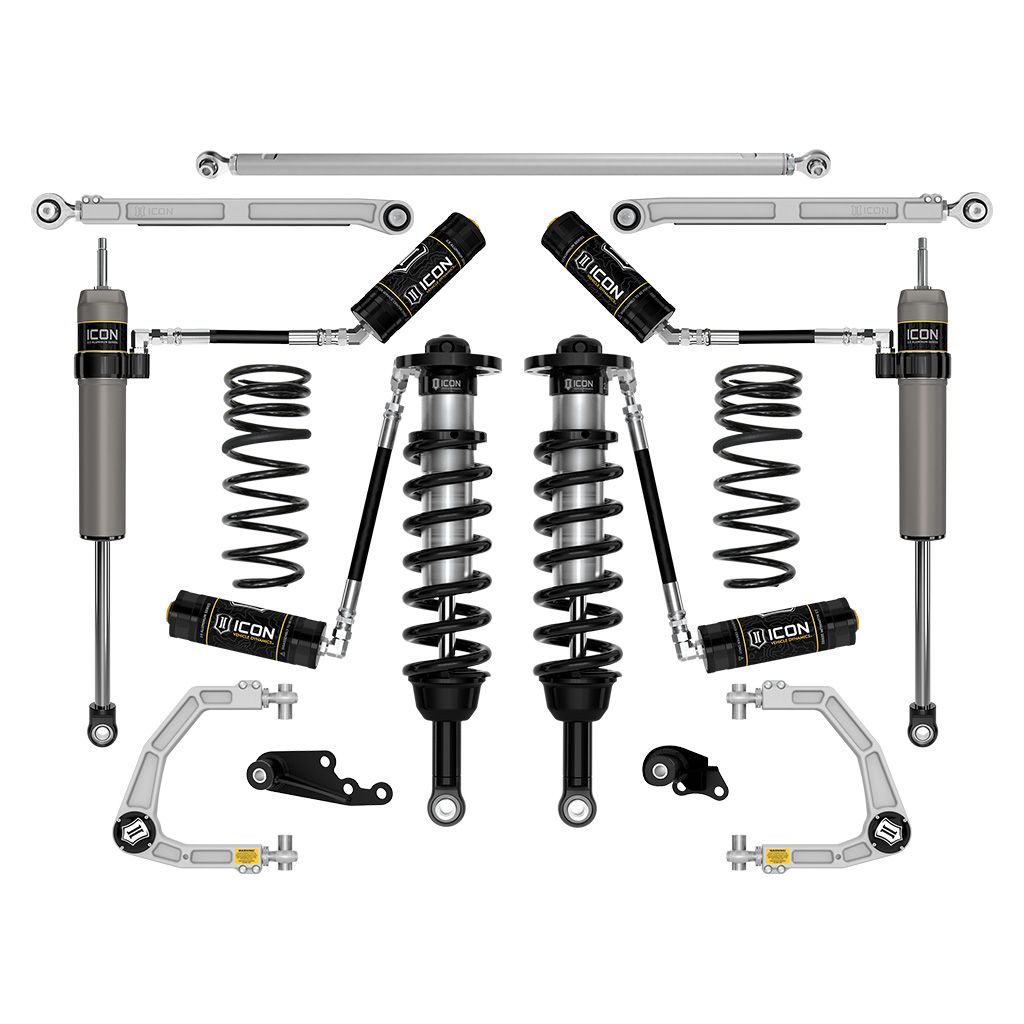 The included ICON billet aluminum upper control arm kit is designed to improve the overall performance of the GX550 with corrected front-end geometry, increased on-vehicle camber and caster adjustment, and improved suspension component clearance. Additionally, replacing the OE ball joint with the all-new, serviceable, and rebuildable ICON Delta Joint PRO allows for full bump and droop travel of the front suspension while eliminating bind. The dual-rate rear coil design provides a softer ride height spring rate with a firmer overload rate that combine to deliver on-road comfort with excellent bottoming resistance and superior off-road performance. 2” of rear lift height over stock allows a for level stance front to rear. The ICON Billet Adjustable Rear Track Bar helps re-center the rear axle and double adjuster rod end threads allow easy “on-vehicle” fine adjustment of track bar length without requiring removal or disassembly of the track bar. ICON billet rear lower links feature on-vehicle adjustability via the ICON double adjuster and employ dual-durometer greaseless bushings at one end, and massive FK rod ends at the other to provide the best combination of free articulation while isolating and damping road noise and vibrations. ICON 2.5 Aluminum Series remote reservoir rear shocks with integrated bump zones provide improved shock damping ability and utilize a vehicle-specific valving that balances the performance of the truck from front to rear. The ICON Vehicle Dynamics 2024-2025 Lexus GX550 Stage 7 suspension system is an excellent choice for those drivers looking to enhance the capabilities of their pickup on the road as well as in the dirt.