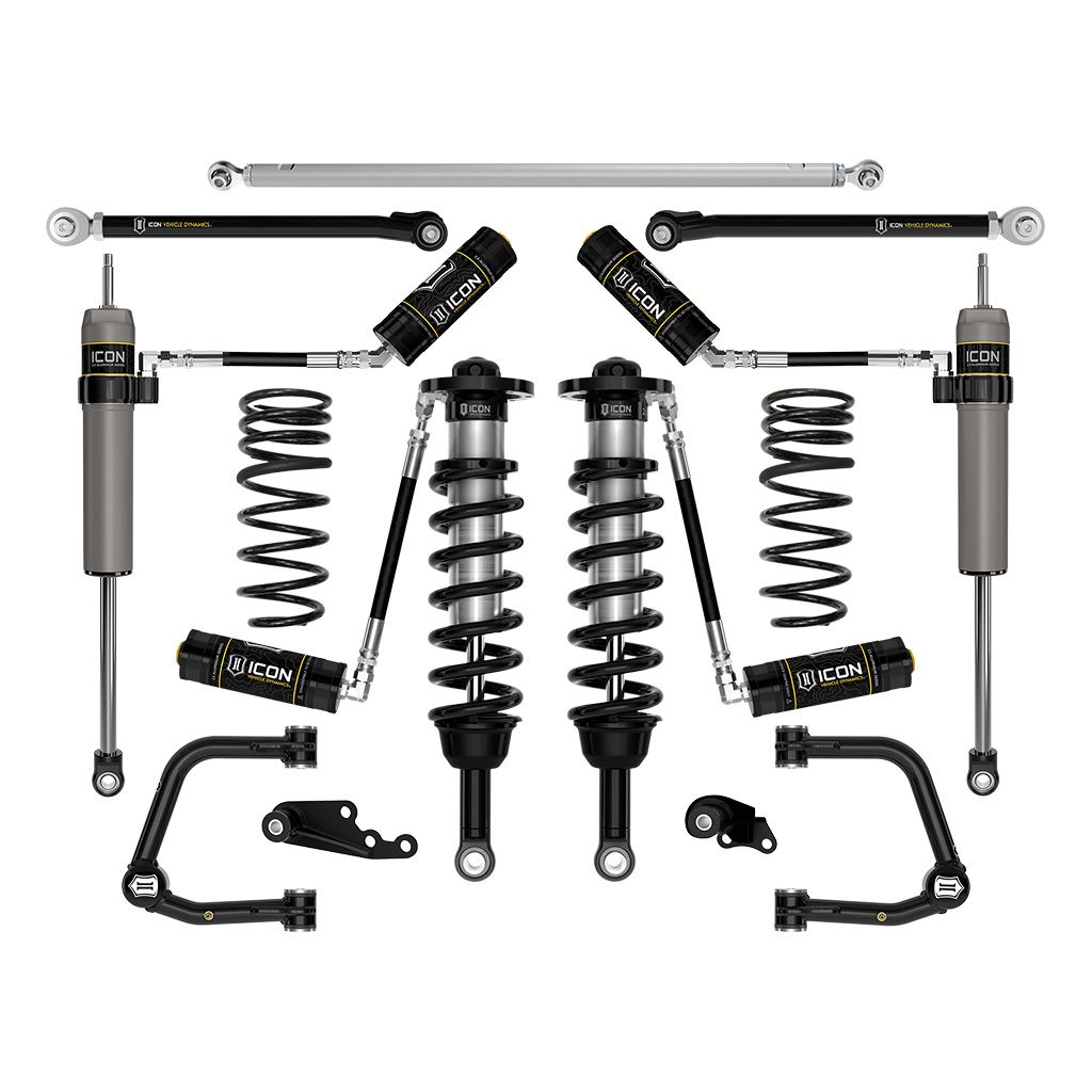 The included ICON tubular upper control arm kit is designed to improve the overall performance of the Lexus GX550 with corrected front-end geometry, built in additional caster, and improved suspension component clearance. Additionally, replacing the OE ball joint with the all-new, serviceable, and rebuildable ICON Delta Joint PRO allows for full bump and droop travel of the front suspension while eliminating bind. The dual-rate rear coil design provides a softer ride height spring rate with a firmer overload rate that combine to deliver on-road comfort with excellent bottoming resistance and superior off-road performance. 2” of rear lift height over stock allows a for level stance front to rear. The ICON Billet Adjustable Rear Track Bar helps re-center the rear axle and double adjuster rod end threads allow easy “on-vehicle” fine adjustment of track bar length without requiring removal or disassembly of the track bar. ICON tubular rear lower links employ dual-durometer greaseless bushings at one end, and massive FK rod ends at the other to provide the best combination of free articulation while isolating and damping road noise and vibrations. ICON 2.5 Aluminum Series remote reservoir rear shocks with integrated bump zones provide improved shock damping ability and utilize a vehicle-specific valving that balances the performance of the truck from front to rear. The ICON Vehicle Dynamics 2024-2025 Lexus GX550 Series Stage 7 suspension system is an excellent choice for those drivers looking to enhance the capabilities of their pickup on the road as well as in the dirt.