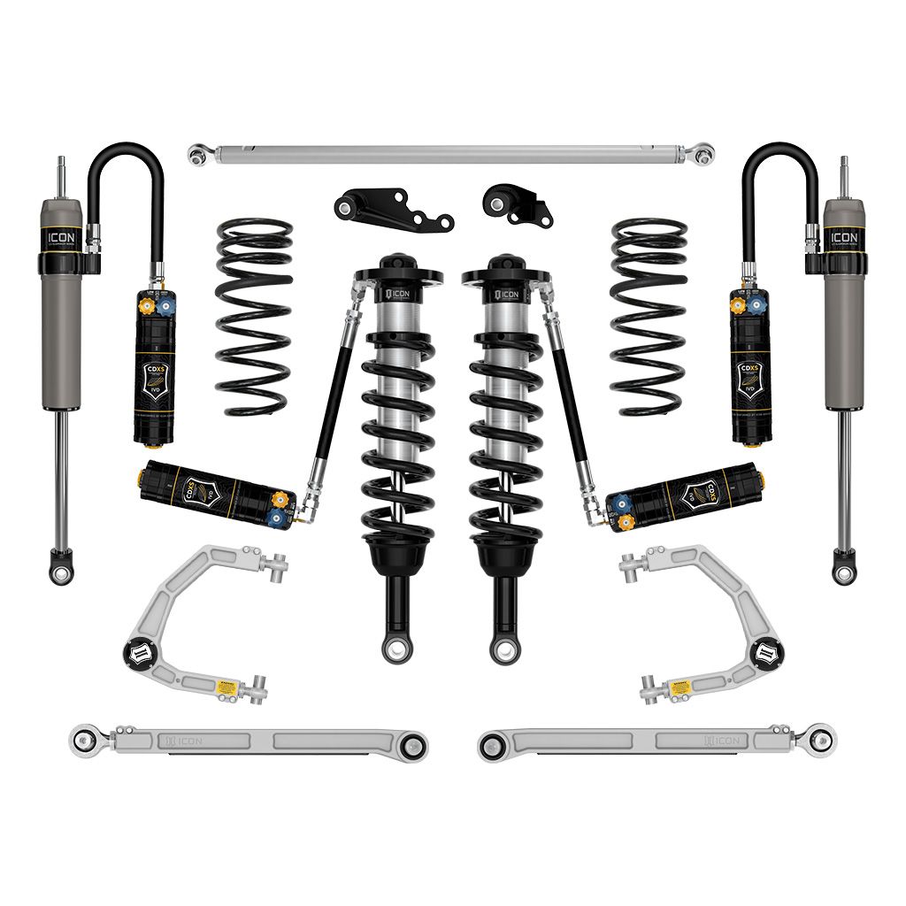 The included ICON billet aluminum upper control arm kit is designed to improve the overall performance of the Lexus GX550 with corrected front-end geometry, increased on-vehicle camber and caster adjustment, and improved suspension component clearance. Additionally, replacing the OE ball joint with the all-new, serviceable, and rebuildable ICON Delta Joint PRO allows for full bump and droop travel of the front suspension while eliminating bind. The dual-rate rear coil design provides a softer ride height spring rate with a firmer overload rate that combine to deliver on-road comfort with excellent bottoming resistance and superior off-road performance. 2” of rear lift height over stock allows a for level stance front to rear. The ICON Billet Adjustable Rear Track Bar helps re-center the rear axle and double adjuster rod end threads allow easy “on-vehicle” fine adjustment of track bar length without requiring removal or disassembly of the track bar. ICON billet rear lower links feature on-vehicle adjustability via the ICON double adjuster and employ dual-durometer greaseless bushings at one end, and massive FK rod ends at the other to provide the best combination of free articulation while isolating and damping road noise and vibrations. ICON 2.5 Aluminum Series CDXS remote reservoir rear shocks with integrated bump zones provide improved shock damping ability and utilize a vehicle-specific valving that balances the performance of the truck from front to rear. The ICON Vehicle Dynamics 2024-2025 Lexus GX550 Stage 8 suspension system is an excellent choice for those drivers looking to enhance the capabilities of their pickup on the road as well as in the dirt.