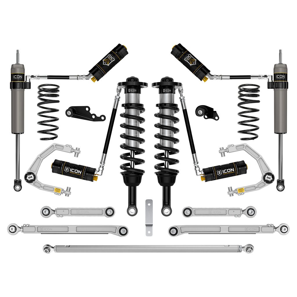 The included ICON billet aluminum upper control arm kit is designed to improve the overall performance of the Lexus GX550 with corrected front-end geometry, increased on-vehicle camber and caster adjustment, and improved suspension component clearance. Additionally, replacing the OE ball joint with the all-new, serviceable, and rebuildable ICON Delta Joint PRO allows for full bump and droop travel of the front suspension while eliminating bind. The dual-rate rear coil design provides a softer ride height spring rate with a firmer overload rate that combine to deliver on-road comfort with excellent bottoming resistance and superior off-road performance. 2” of rear lift height over stock allows a for level stance front to rear. The ICON Billet Adjustable Rear Track Bar helps re-center the rear axle and double adjuster rod end threads allow easy “on-vehicle” fine adjustment of track bar length without requiring removal or disassembly of the track bar. ICON billet rear upper and lower links feature on-vehicle adjustability via the ICON double adjuster and employ dual-durometer greaseless bushings at one end, and massive FK rod ends at the other to provide the best combination of free articulation while isolating and damping road noise and vibrations. ICON 2.5 Aluminum Series CDCV remote reservoir rear shocks with integrated bump zones provide improved shock damping ability and utilize a vehicle-specific valving that balances the performance of the truck from front to rear. The ICON Vehicle Dynamics 2024-2025 Lexus GX550 Stage 9 suspension system is an excellent choice for those drivers looking to enhance the capabilities of their pickup on the road as well as in the dirt.