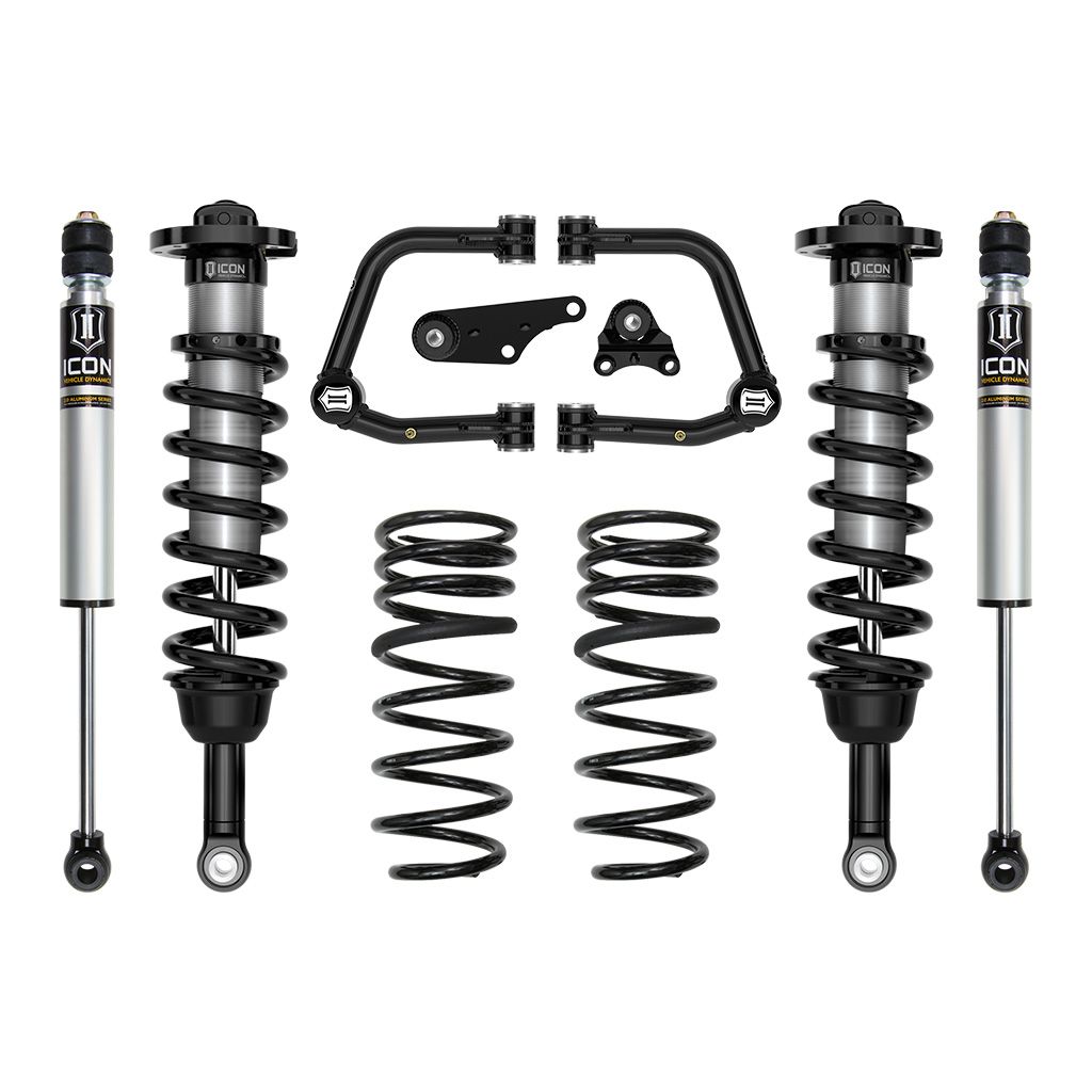 The included ICON tubular upper control arm kit is designed to improve the overall performance of the Land Cruiser with corrected front-end geometry, built in additional caster, and improved suspension component clearance. Additionally, replacing the OE ball joint with the all-new, serviceable, and rebuildable ICON Delta Joint PRO allows for full bump and droop travel of the front suspension while eliminating bind. The dual-rate rear coil design provides a softer ride height spring rate with a firmer overload rate that combine to deliver on-road comfort with excellent bottoming resistance and superior off-road performance. 2” of rear lift height over stock allows a for level stance front to rear. ICON 2.0 Aluminum Series internal reservoir rear shocks utilize a vehicle-specific valving that balances the performance of the truck from front to rear. The ICON Vehicle Dynamics 2024-2025 Toyota Land Cruiser 250 Series Stage 2 suspension system is an excellent choice for those drivers looking to enhance the capabilities of their pickup on the road as well as in the dirt.