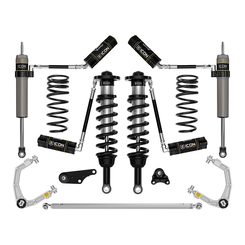 The included ICON billet aluminum upper control arm kit is designed to improve the overall performance of the Toyota Land Cruiser with corrected front-end geometry, increased on-vehicle camber and caster adjustment, and improved suspension component clearance. Additionally, replacing the OE ball joint with the all-new, serviceable, and rebuildable ICON Delta Joint PRO allows for full bump and droop travel of the front suspension while eliminating bind. The dual-rate rear coil design provides a softer ride height spring rate with a firmer overload rate that combine to deliver on-road comfort with excellent bottoming resistance and superior off-road performance. 2” of rear lift height over stock allows a for level stance front to rear. The ICON Billet Adjustable Rear Track Bar helps re-center the rear axle and double adjuster rod end threads allow easy “on-vehicle” fine adjustment of track bar length without requiring removal or disassembly of the track bar. ICON 2.5 Aluminum Series remote reservoir rear shocks with integrated bump zones provide improved shock damping ability and utilize a vehicle-specific valving that balances the performance of the truck from front to rear. The ICON Vehicle Dynamics 2024-2025 Toyota Land Cruiser 250 Series Stage 6 suspension system is an excellent choice for those drivers looking to enhance the capabilities of their pickup on the road as well as in the dirt.