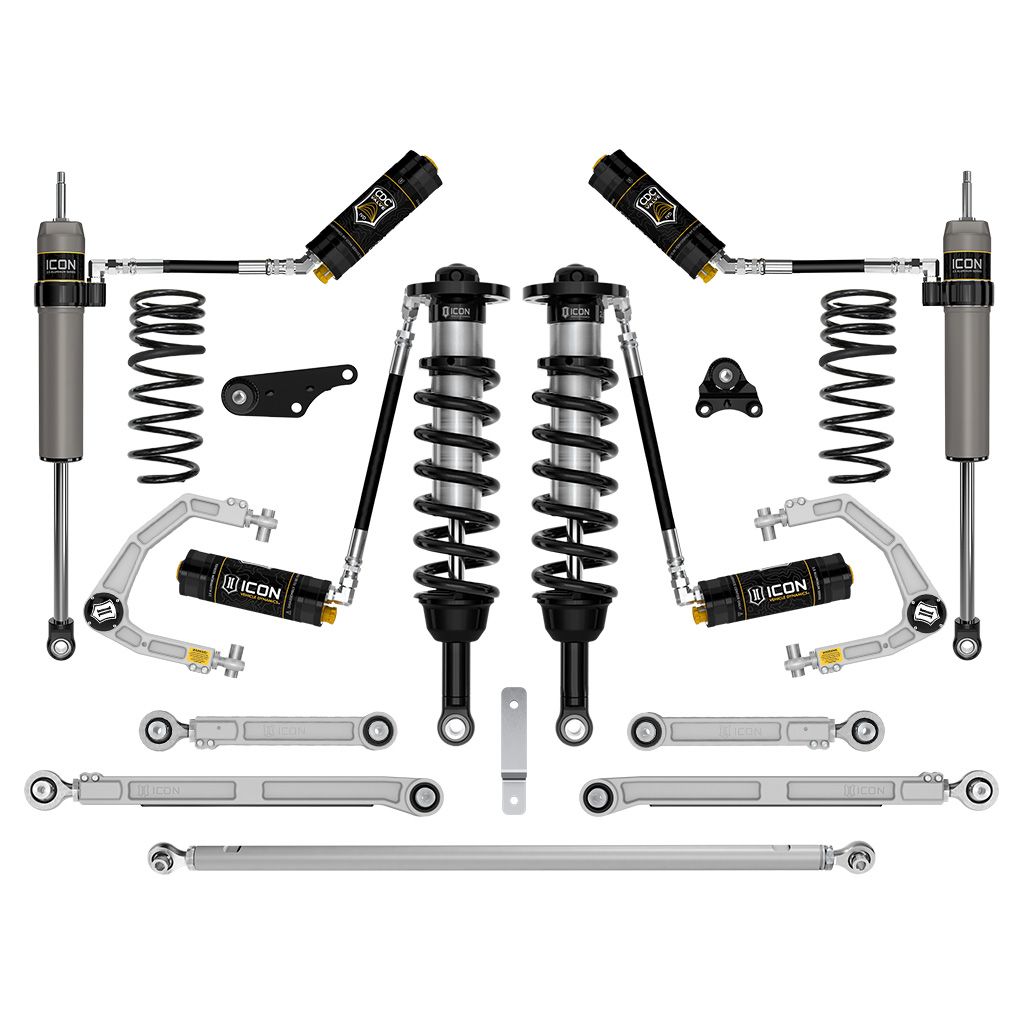 The included ICON billet aluminum upper control arm kit is designed to improve the overall performance of the Toyota Land Cruiser with corrected front-end geometry, increased on-vehicle camber and caster adjustment, and improved suspension component clearance. Additionally, replacing the OE ball joint with the all-new, serviceable, and rebuildable ICON Delta Joint PRO allows for full bump and droop travel of the front suspension while eliminating bind. The dual-rate rear coil design provides a softer ride height spring rate with a firmer overload rate that combine to deliver on-road comfort with excellent bottoming resistance and superior off-road performance. 2” of rear lift height over stock allows a for level stance front to rear. The ICON Billet Adjustable Rear Track Bar helps re-center the rear axle and double adjuster rod end threads allow easy “on-vehicle” fine adjustment of track bar length without requiring removal or disassembly of the track bar. ICON billet rear upper and lower links feature on-vehicle adjustability via the ICON double adjuster and employ dual-durometer greaseless bushings at one end, and massive FK rod ends at the other to provide the best combination of free articulation while isolating and damping road noise and vibrations. ICON 2.5 Aluminum Series CDCV remote reservoir rear shocks with integrated bump zones provide improved shock damping ability and utilize a vehicle-specific valving that balances the performance of the truck from front to rear. The ICON Vehicle Dynamics 2024-2025 Toyota Land Cruiser 250 Series Stage 9 suspension system is an excellent choice for those drivers looking to enhance the capabilities of their pickup on the road as well as in the dirt.