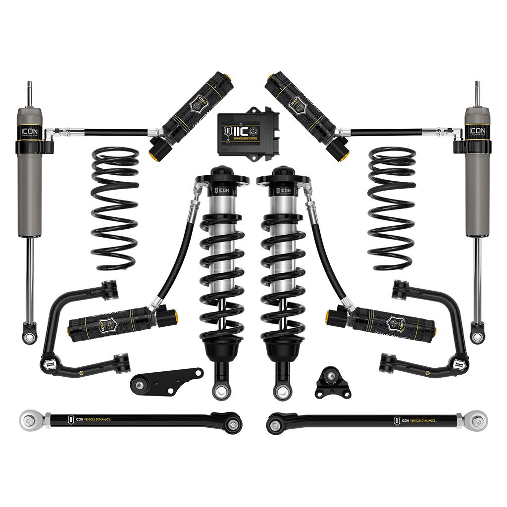 ICON tubular upper control arm kit is designed to improve the overall performance of the new 2024-2025 Toyota Tacoma with corrected front-end geometry, built in additional caster, and improved suspension component clearance. Replacing the OE ball joint with the all-new, serviceable, and rebuildable ICON Delta Joint PRO allows for full bump and droop travel of the front suspension while eliminating bind. The rear dual rate coil design provides a softer ride rate with a firmer overload rate that combine to deliver on-road comfort with excellent load support, bottoming resistance, and superior off-road performance. These rear springs are designed to net .5" of rear lift over stock with approximately 600lbs of additional weight added to the rear, for a more aggressive stance and increased fender clearance for larger wheels and tires on more outfitted vehicles. ICON tubular rear lower links employ dual-durometer greaseless bushings at one end, and massive FK rod ends at the other to provide the best combination of free articulation while isolating and damping road noise and vibrations. ICON 2.5 Aluminum Series CDEV remote reservoir rear shocks with integrated bump zones provide improved shock damping ability and utilize a vehicle-specific valving that balances the performance of the truck from front to rear. The ICON Vehicle Dynamics 2024-2025 Toyota Tacoma Stage 10 suspension system is an excellent choice for those drivers looking to enhance the capabilities of their pickup on the road as well as in the dirt.