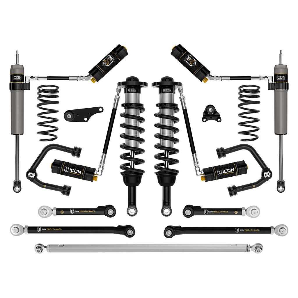 ICON tubular upper control arm kit is designed to improve the overall performance of the new 2024-2025 Toyota Tacoma with corrected front-end geometry, built in additional caster, and improved suspension component clearance. Replacing the OE ball joint with the all-new, serviceable, and rebuildable ICON Delta Joint PRO allows for full bump and droop travel of the front suspension while eliminating bind. The rear triple-rate coil design provides a softer droop and ride rates with a firmer overload rate that combine to deliver on-road comfort with excellent bottoming resistance and superior off-road performance. ICON tubular rear upper and lower links employ dual-durometer greaseless bushings at one end, and massive FK rod ends at the other to provide the best combination of free articulation while isolating and damping road noise and vibrations. The ICON Billet Adjustable Rear Track Bar helps re-center the rear axle and double adjuster rod end threads allow easy “on-vehicle” fine adjustment of track bar length without requiring removal or disassembly of the track bar. ICON 2.5 Aluminum Series CDCV remote reservoir rear shocks with integrated bump zones provide improved shock damping ability and utilize a vehicle-specific valving that balances the performance of the truck from front to rear. The ICON Vehicle Dynamics 2024-2025 Toyota Tacoma Stage 11 suspension system is an excellent choice for those drivers looking to enhance the capabilities of their pickup on the road as well as in the dirt.